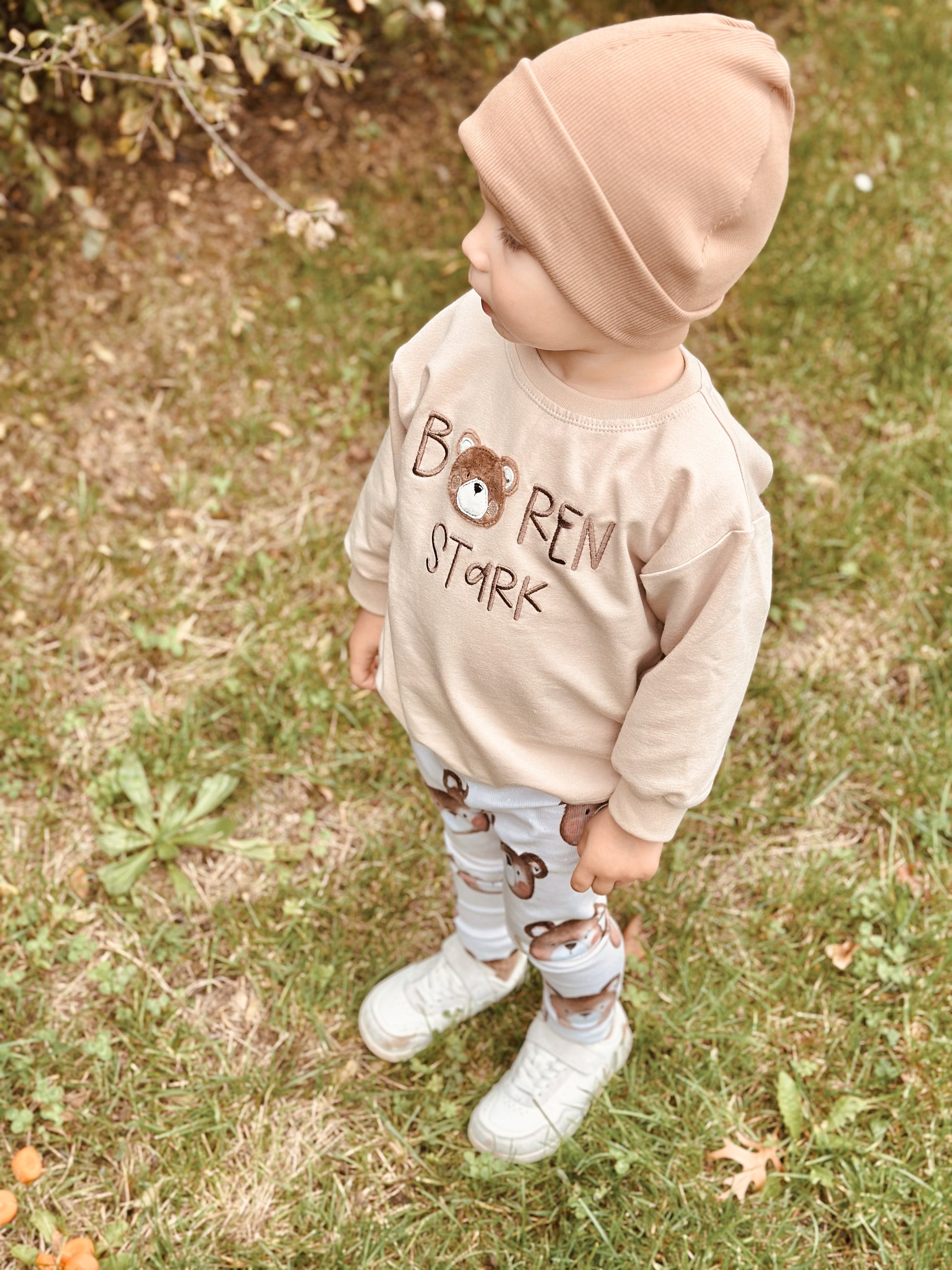 Das Set besteht aus einem beigen oversized Sweater mit dem Stickbild "Bärenstark".