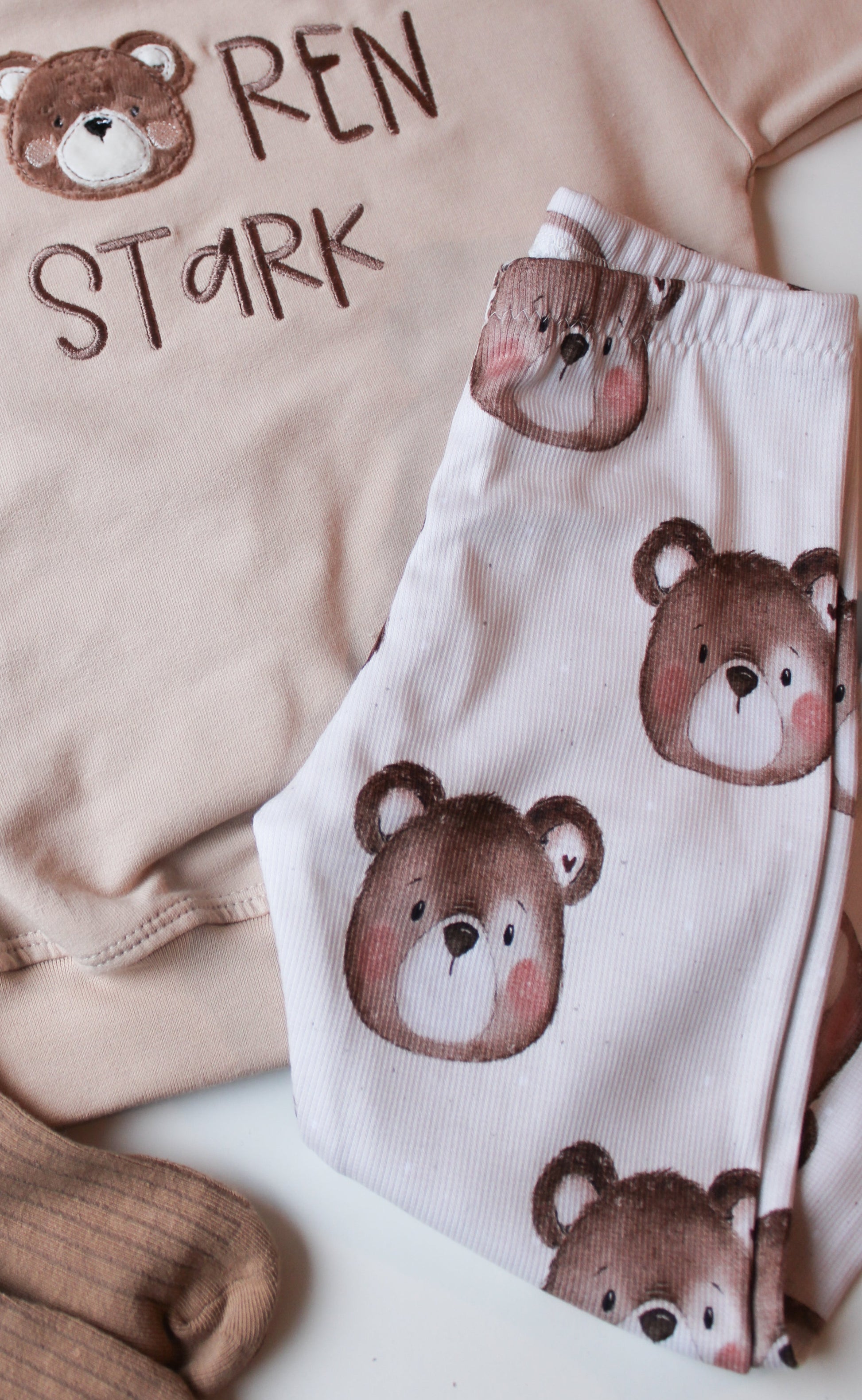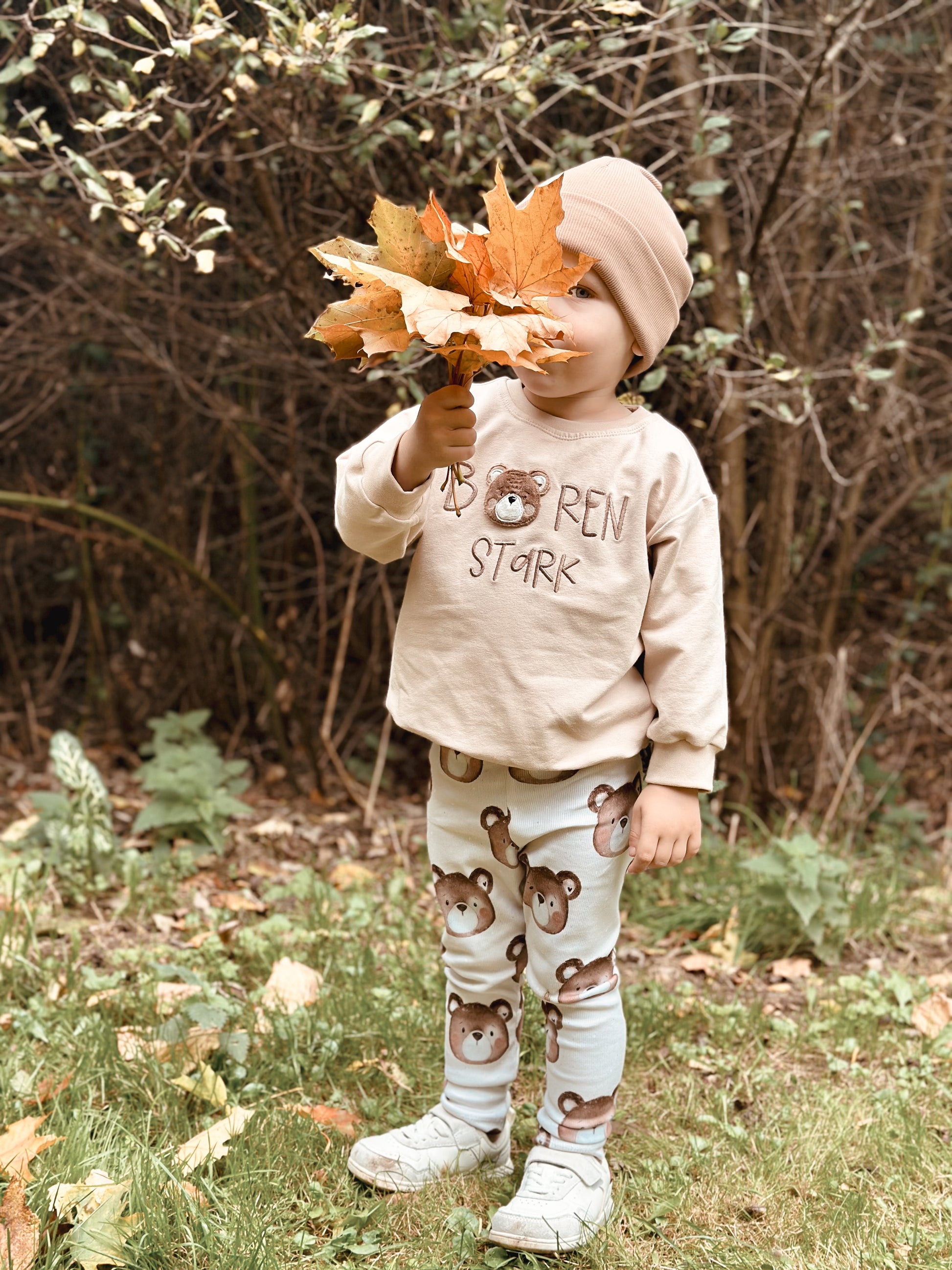 Die Leggings ist aus einem Ribjersey mit Bärenprint. Wahlweise einem Bauchbündchen (bis Größe 92) oder einem weichem Gummibund (auf den Bildern sieht man den Gummibund). Verfügbar in den Größen 56 -122.