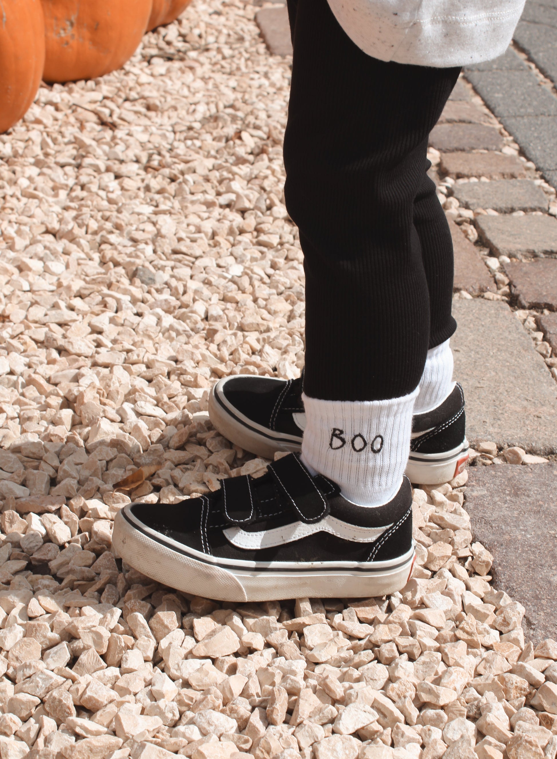 Diese weißen Kinder-Socken mit dem süßen „BOO“-Schriftzug sind das perfekte kleine Highlight für die Herbst- und Halloweenzeit. Das schlichte Design wird durch die verspielte Stickerei zum echten Hingucker. Ob als Ergänzung zu einem herbstlichen Outfit oder in Kombination mit unserem „Spooky Dude“-Sweatshirt – diese Socken sind nicht nur bequem, sondern sorgen auch garantiert für ein kleines Lächeln.