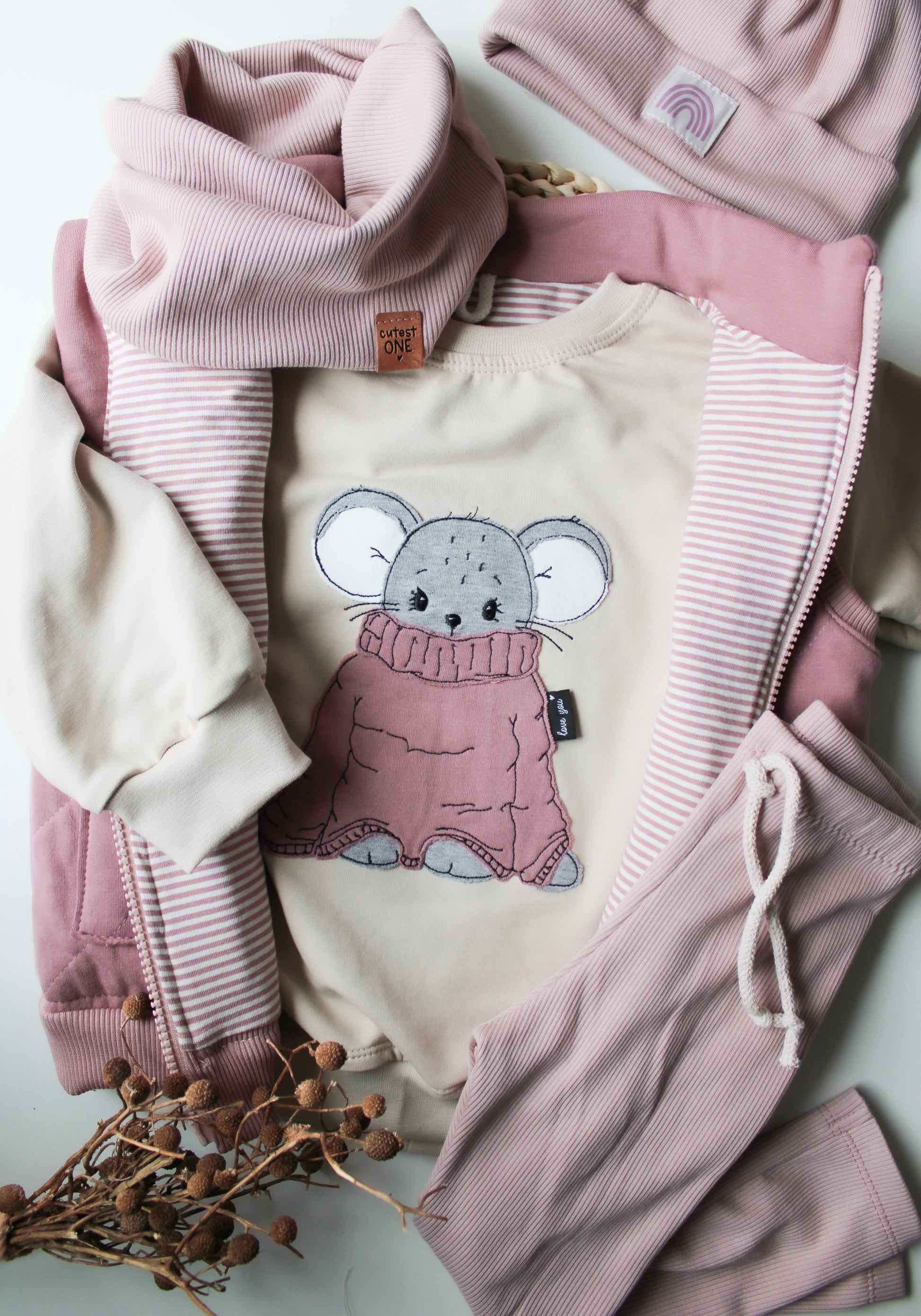 Der oversized Sweater ist aus einem hellbeigen French Terry. Auf dem Sweater wird das Stickbild "Cozy Mouse" aufgestickt und mit einem kleinen Label versehen.
