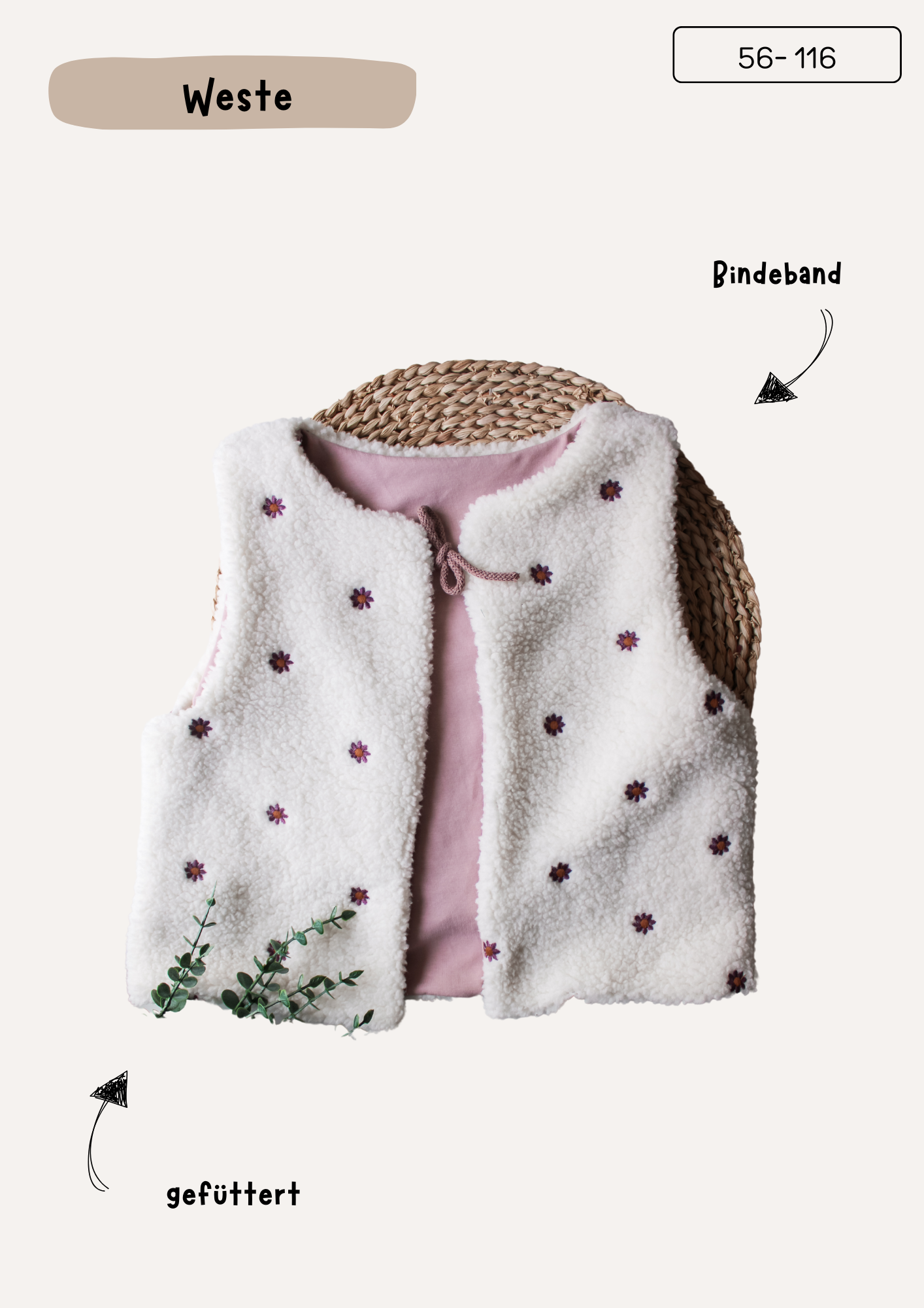 Diese kuschelige Kinderweste ist der perfekte Begleiter für kühlere Tage. Die Weste ist in den Größen 56 bis 116 erhältlich und eignet sich ideal zum Überziehen – ob für den Spaziergang oder zum gemütlichen Spielen drinnen.