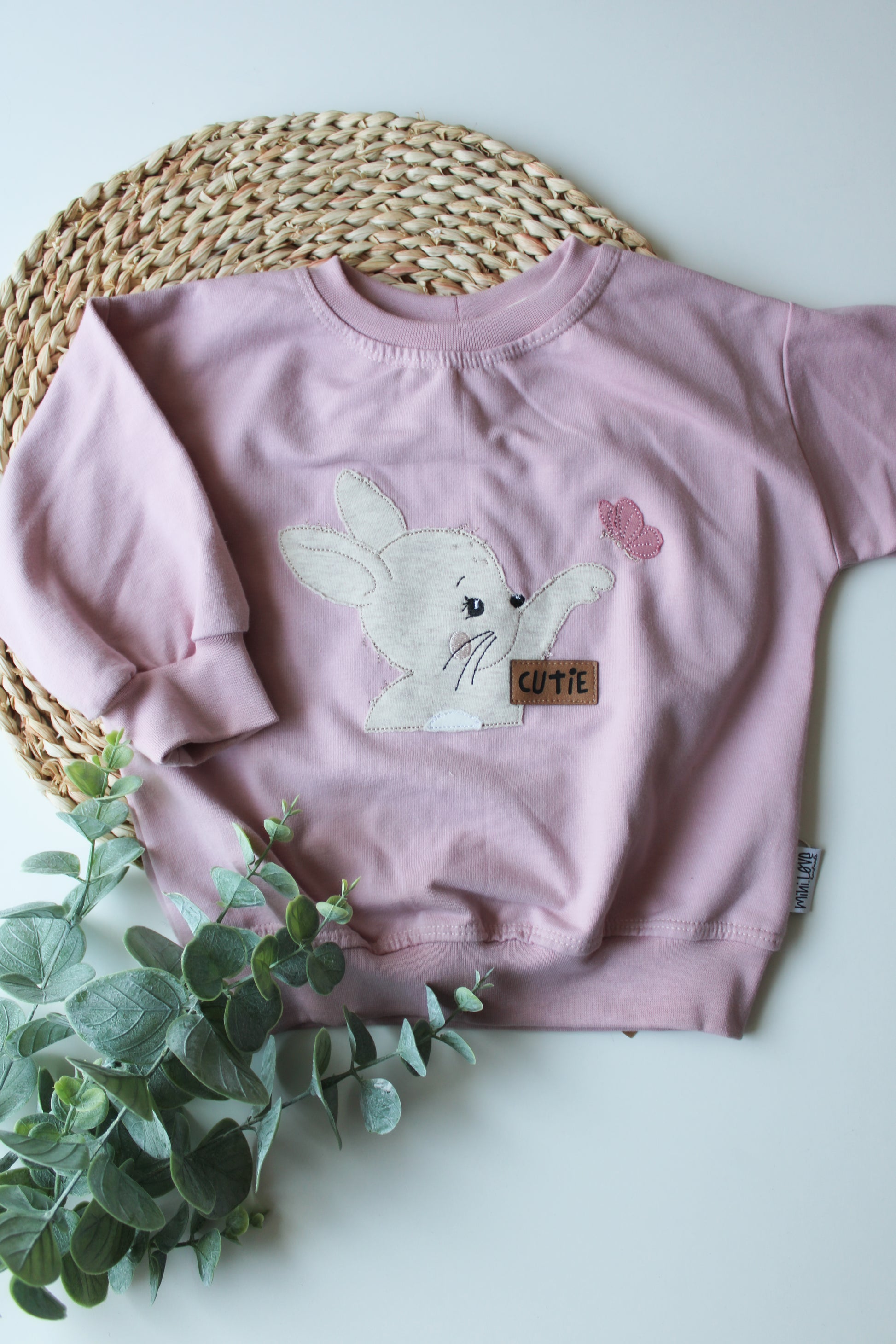 Rosa Oversized Sweater (French Terry) mit einem süßen Hasen-Stickbild und Label "Cutie".