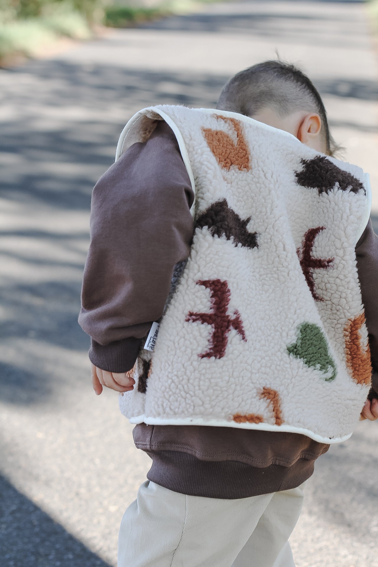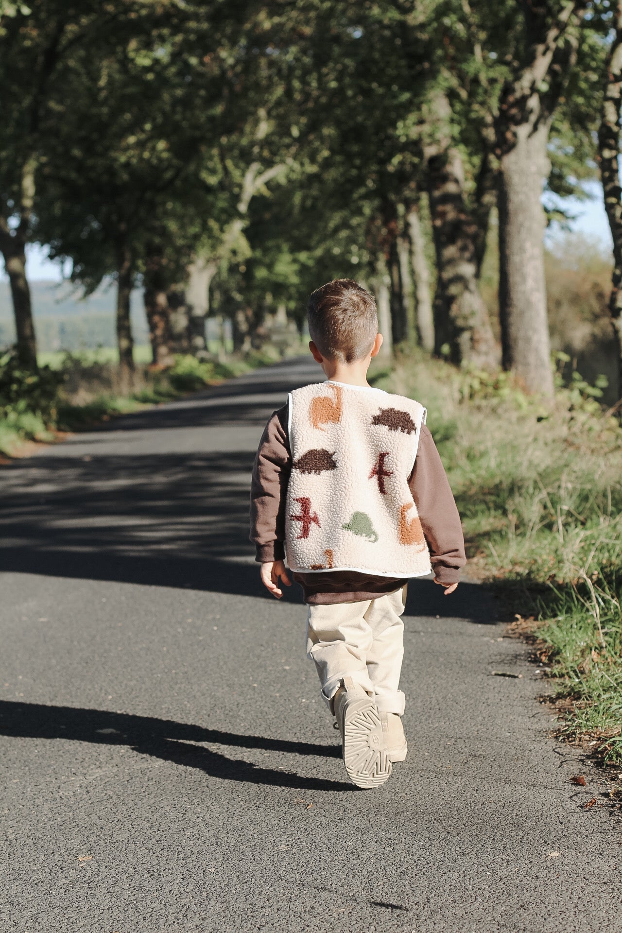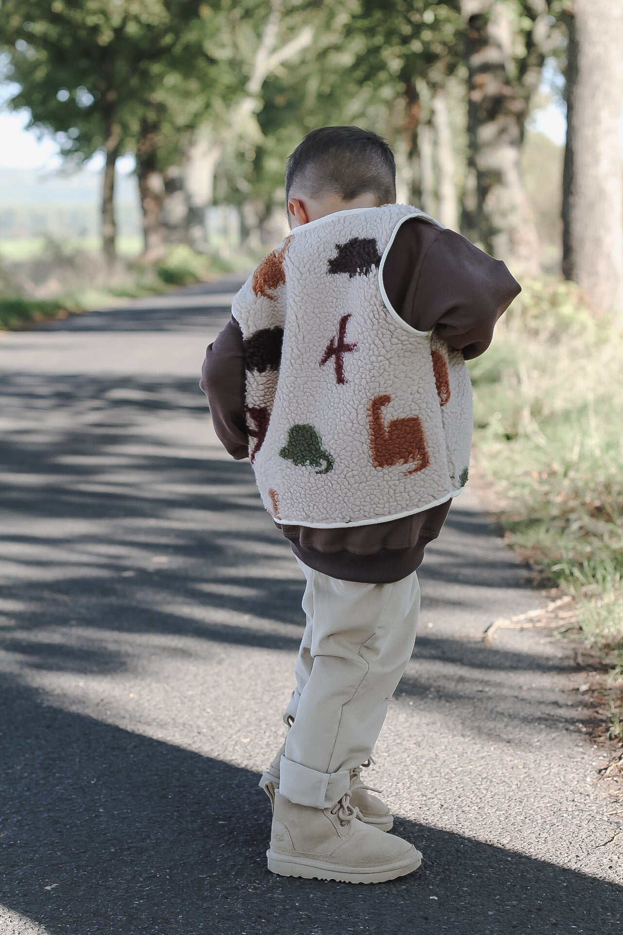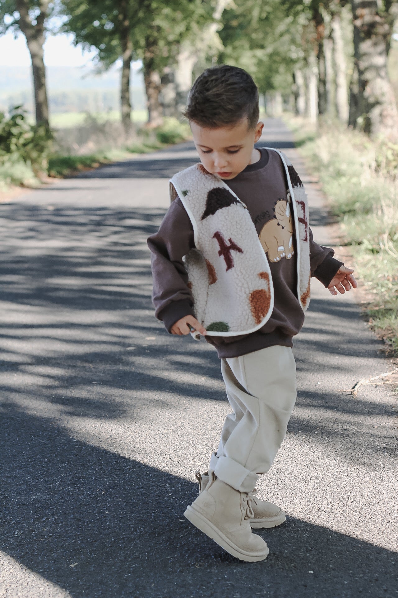 Die Dino Weste besteht aus einem kuscheligen Teddystoff mit Dinomuster. Sie wird mit einem Knopf geschlossen und ist NICHT gefüttert.