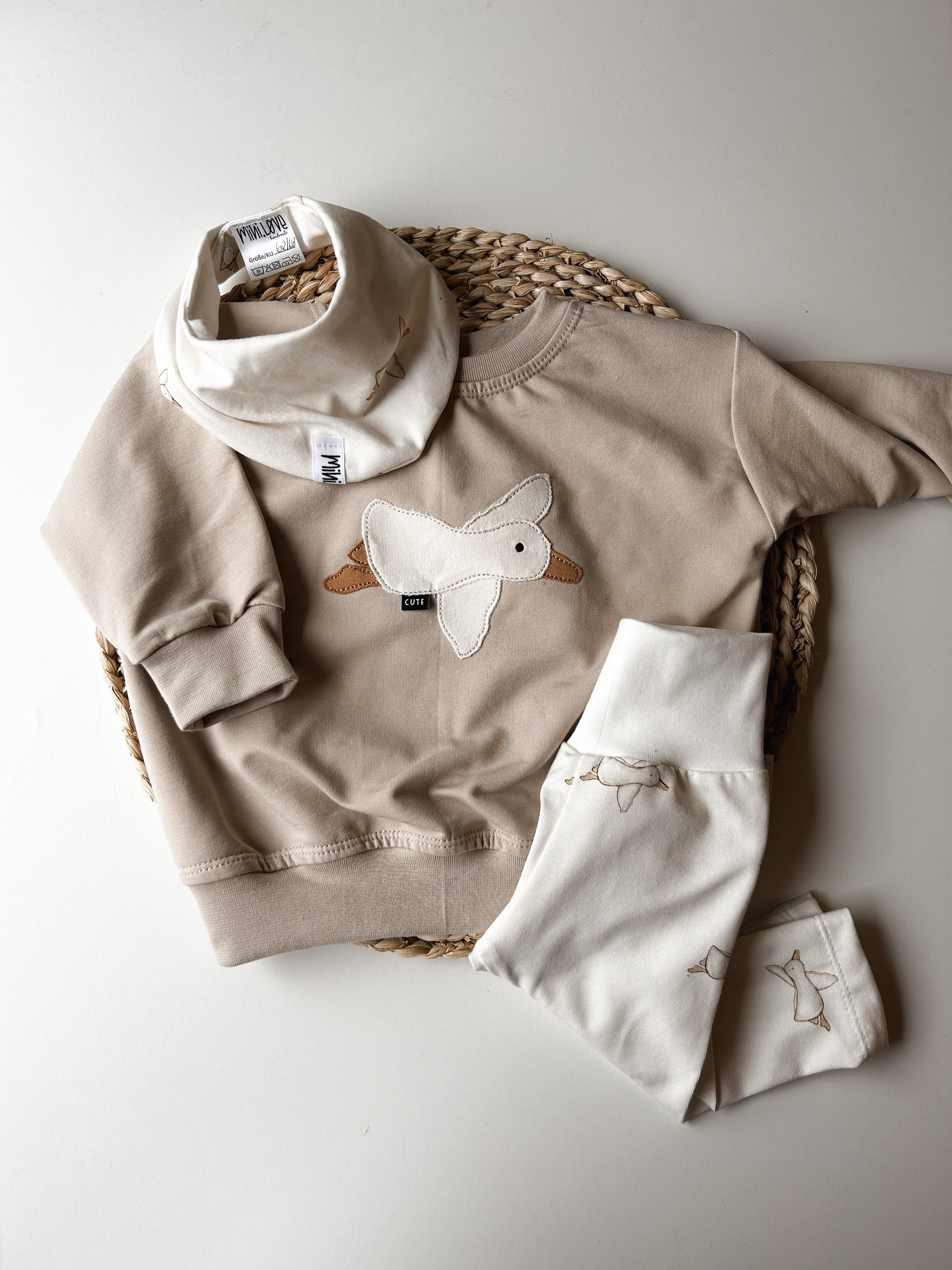 Der oversized Sweater ist Hellbeige und ist mit dem Stickbild "little Goose" bestickt.