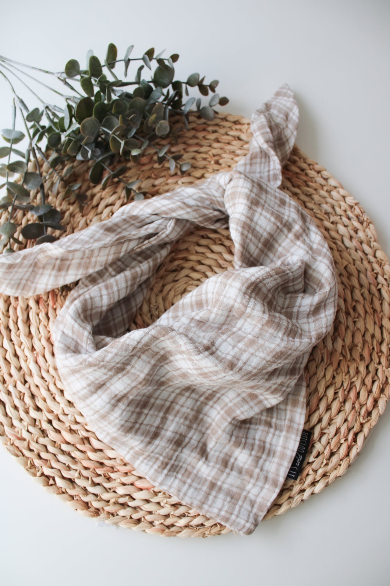 Das Halstuch wird am Nacken zusammen geknotet und bestehen aus einem super weichen Musselinstoff. Das Halstuch wird in 50x50/ 70x70cm zugeschnitten und dann als Dreieck zusammen genäht.