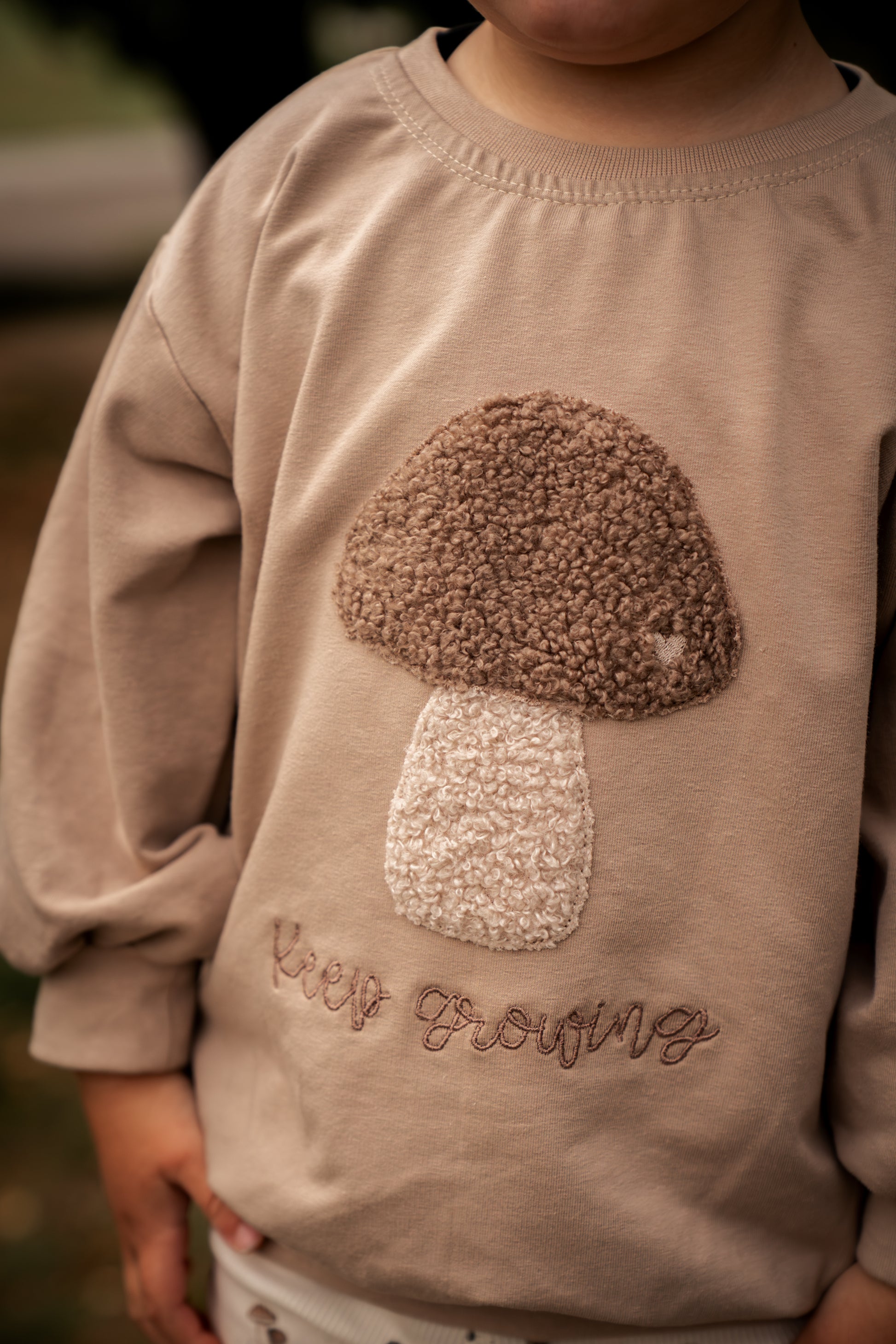 Der oversized Sweater ist aus einem dunkelbeigem French Terry und hat weite Ärmel. Auf dem Sweater wird das Stickbild "Keep Growing" aufgestickt.