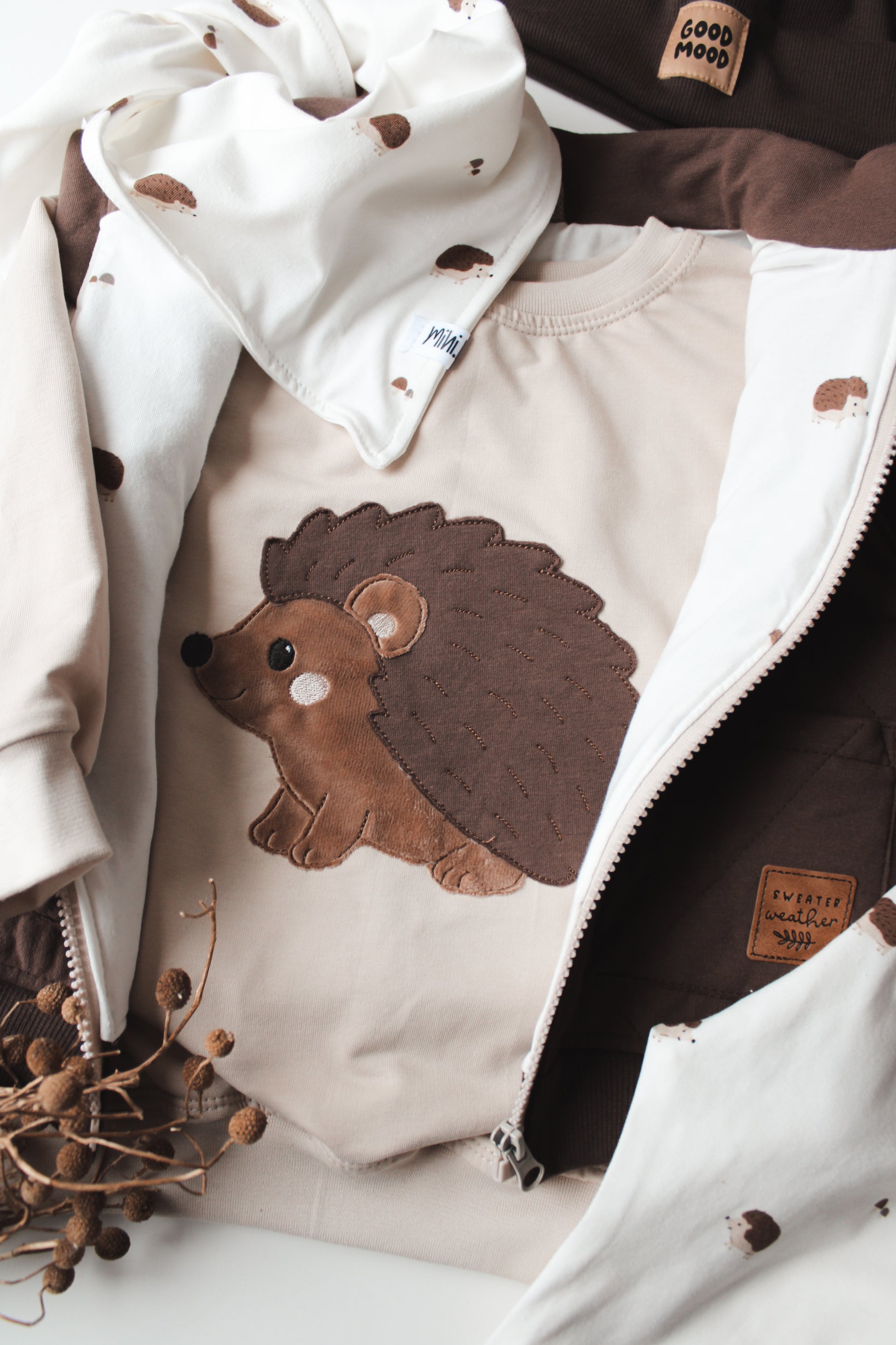 Der oversized Sweater ist aus einem hellbeigen French Terry. Auf dem Sweater wird das Stickbild "Kleiner Igel" aufgestickt und mit einem kleinen Label versehen.