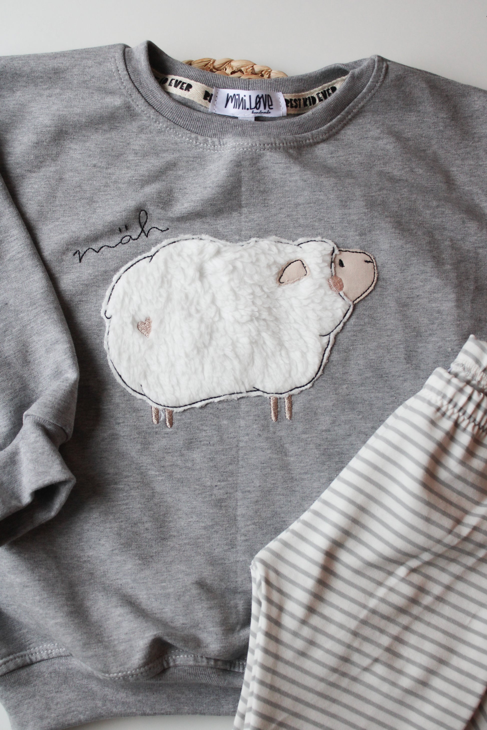 Der oversized Sweater ist aus einem grau melierten French Terry. Auf dem Sweater wird das Stickbild "Little Sheep" aufgestickt.