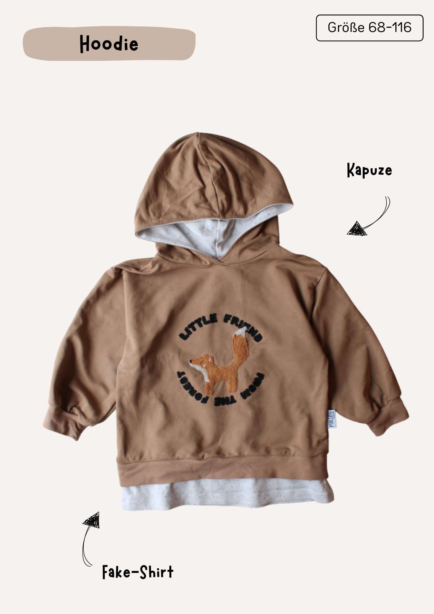 Wählst du aus, dass du den Hoodie mit Fake-Shirt haben möchtest, guckt am Bündchen ein stück Jersey raus, dass aussieht, als hätte dein Kind ein etwas längeres Shirt unter dem Hoodie an. Wähle dafür bitte auch aus, aus welchem Stoff das Fake-Shirt sein soll.