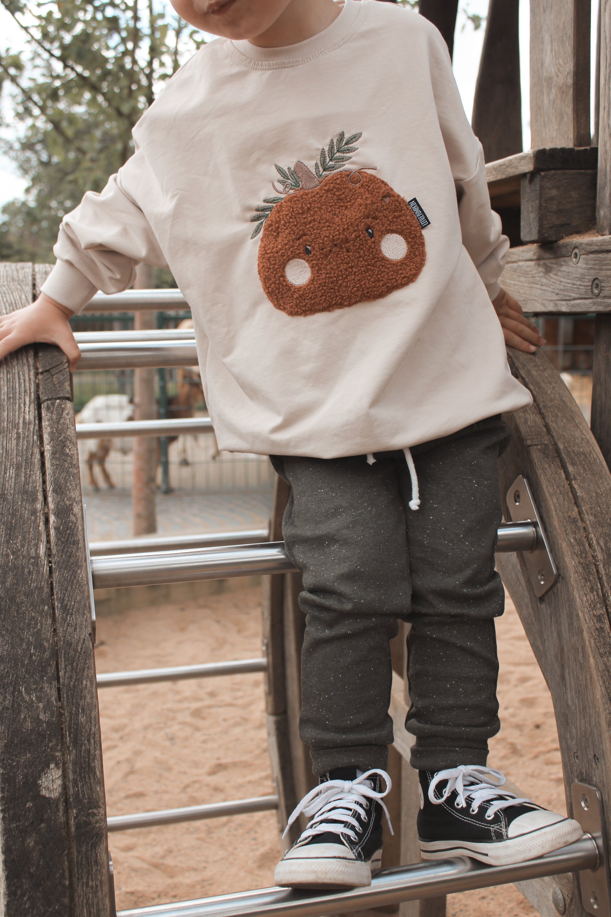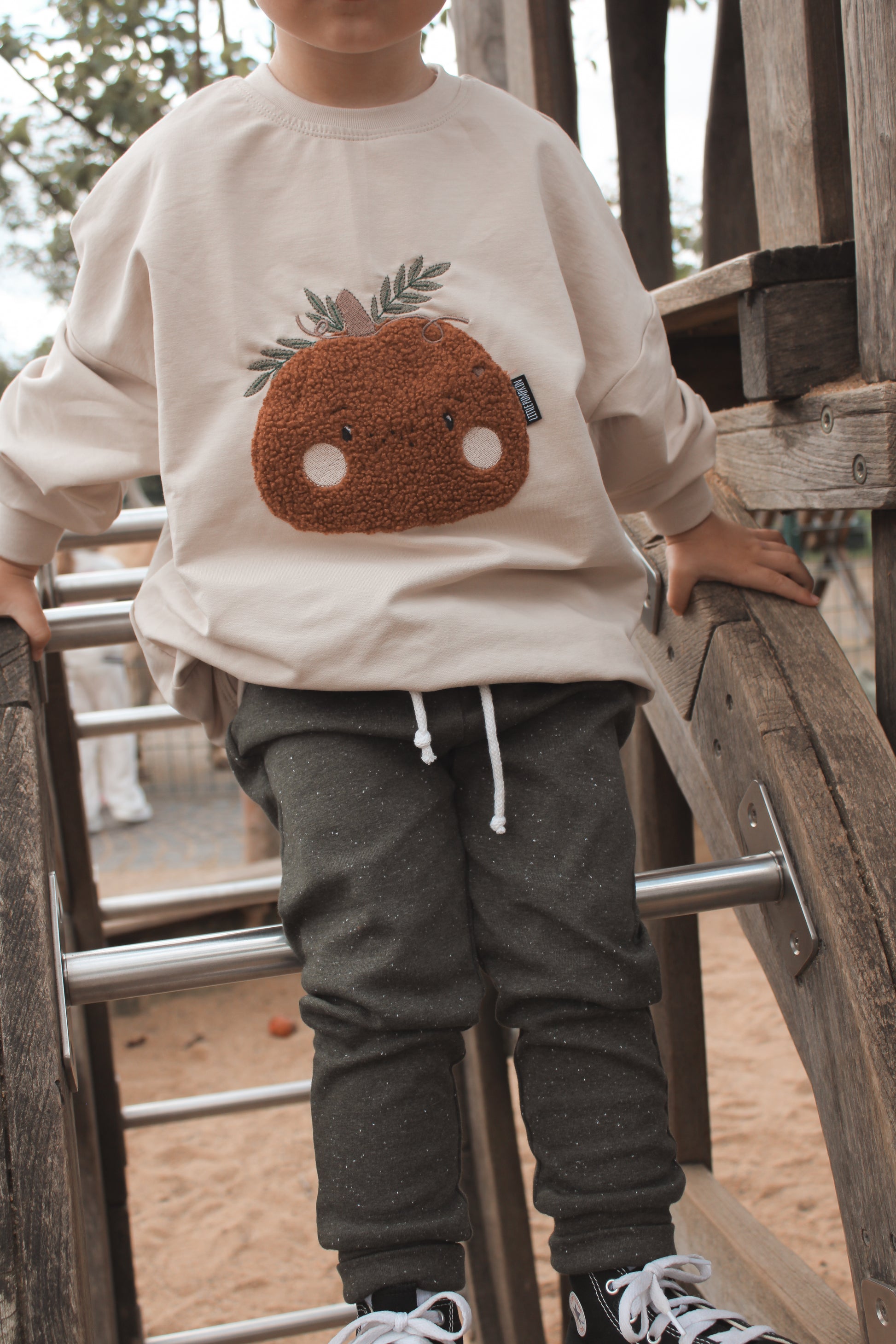 Das Set besteht aus einem beigen oversized Sweater mit dem Stickbild "Kürbis" und dem passenden Label "little Pumpkin".