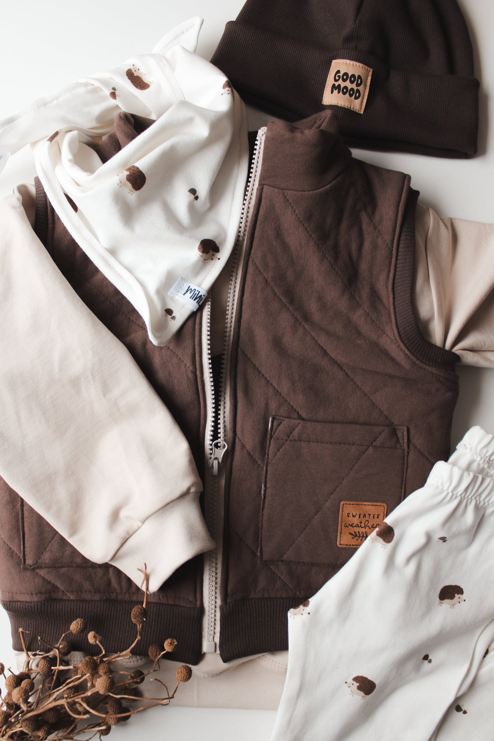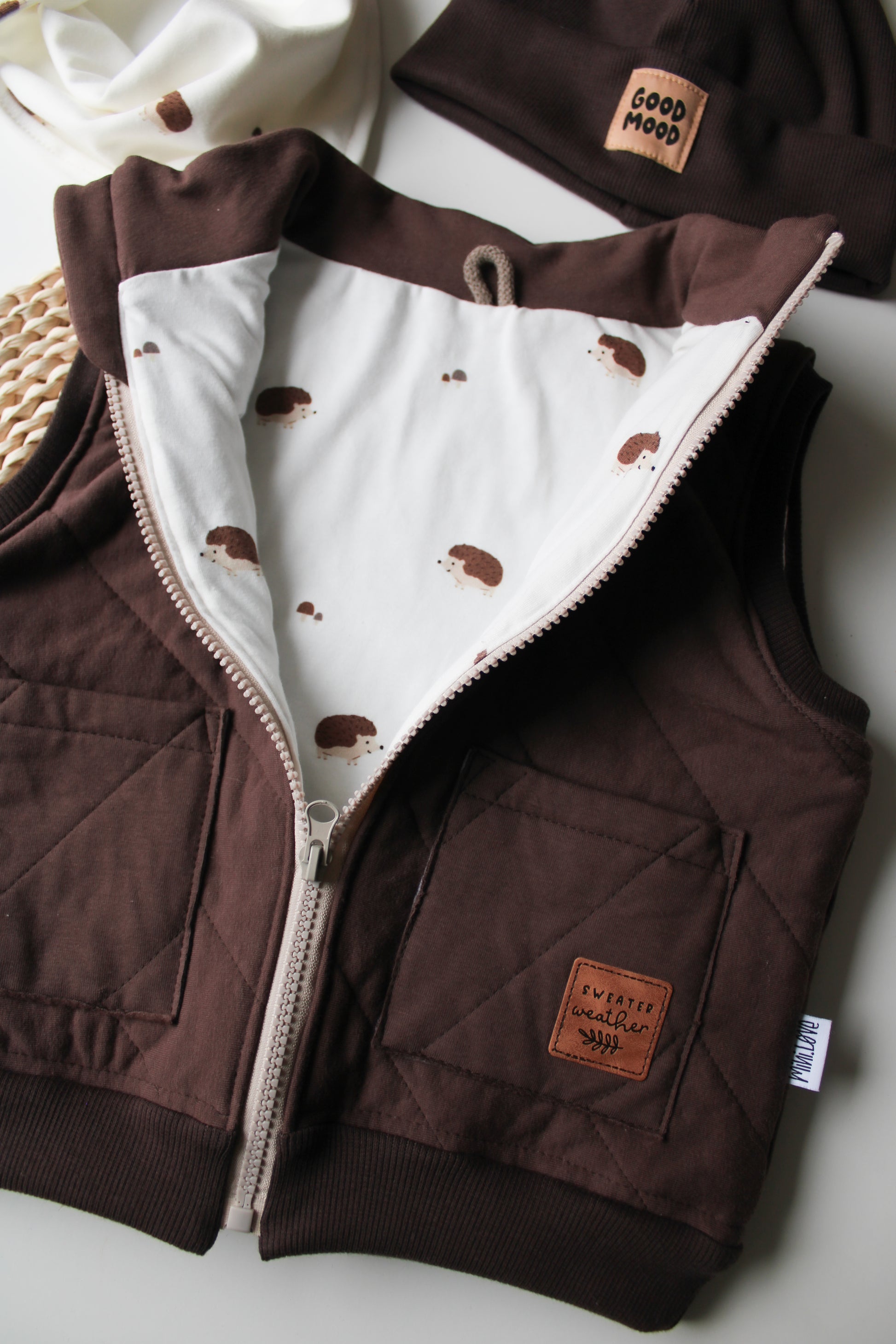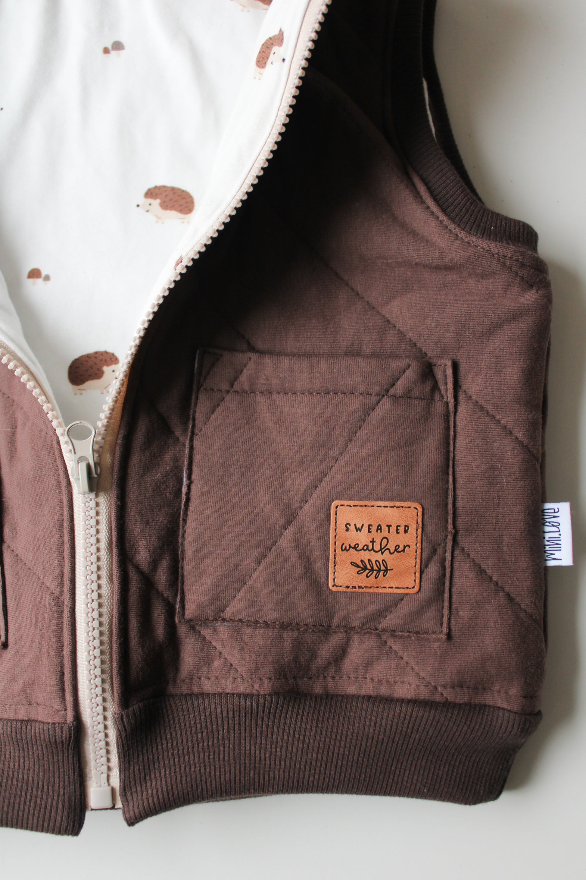 Vorne lässt sich die Weste mit einem praktischen Reißverschluss schließen – auf Wunsch auch mit einem magnetischen Reißverschluss, damit Kinder sie ganz einfach selbst öffnen und schließen können. Zwei aufgesetzte Taschen bieten Platz für kleine Schätze, und ein liebevolles Detail ist das Label „Sweater Weather“ auf einer der Taschen.