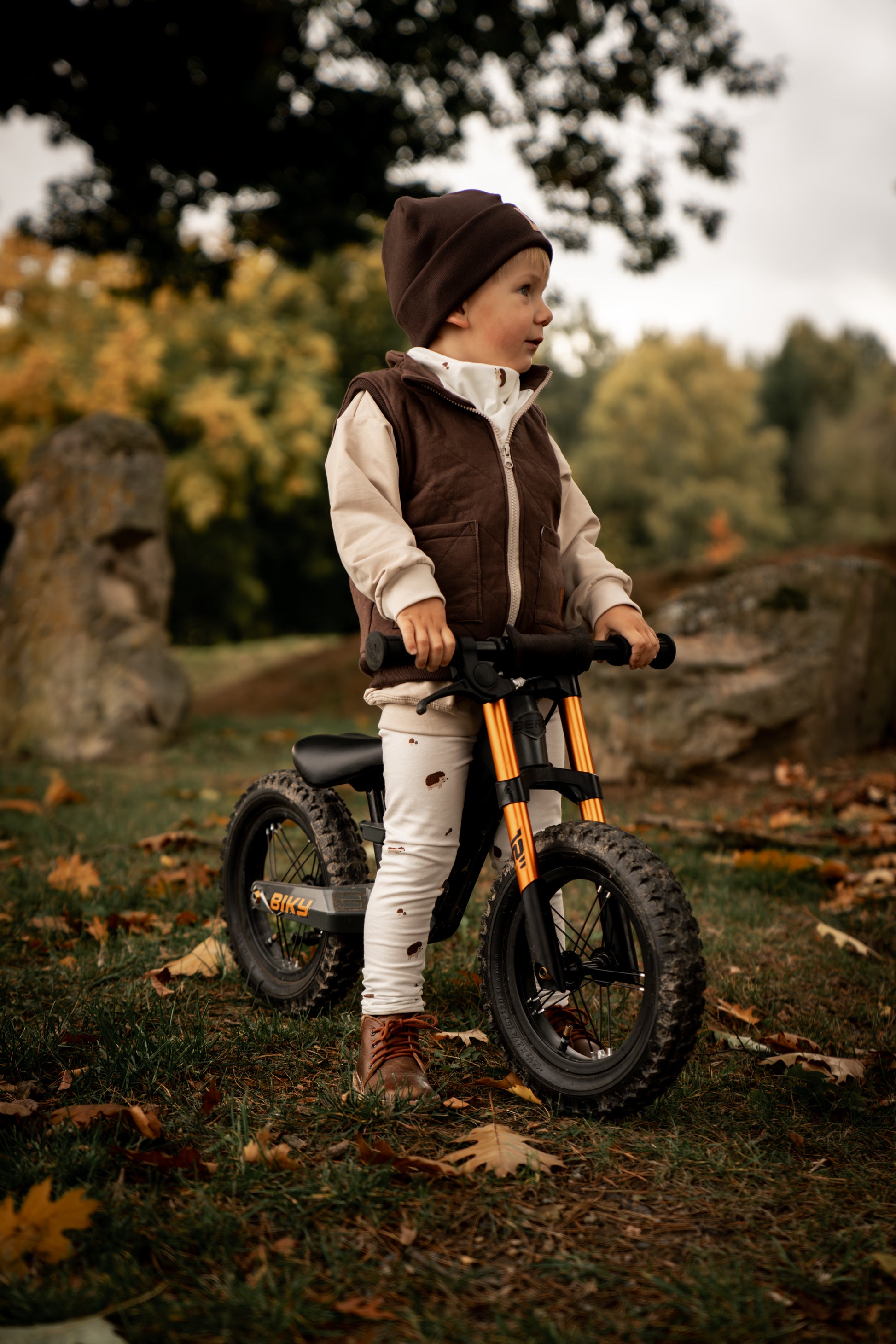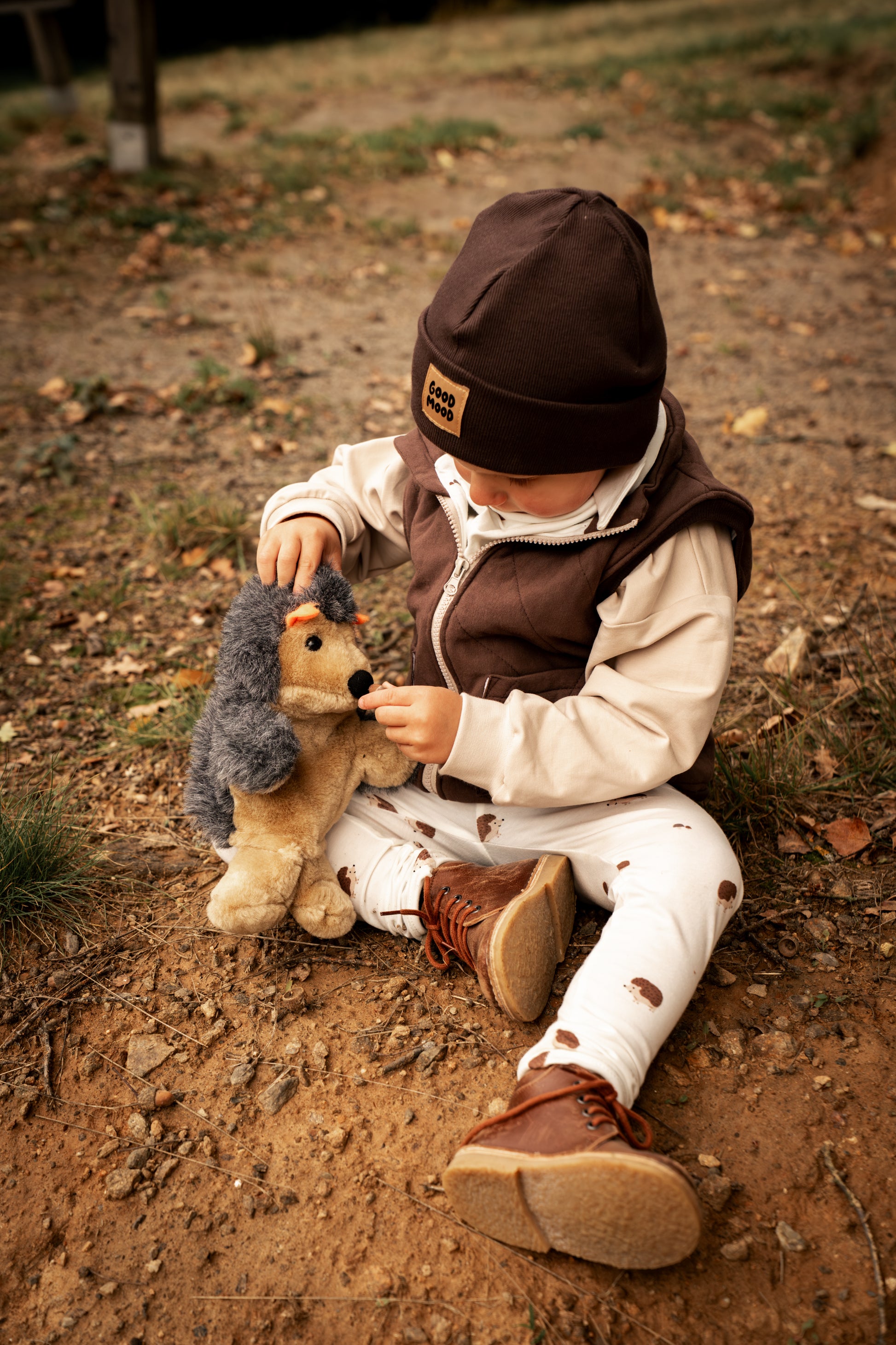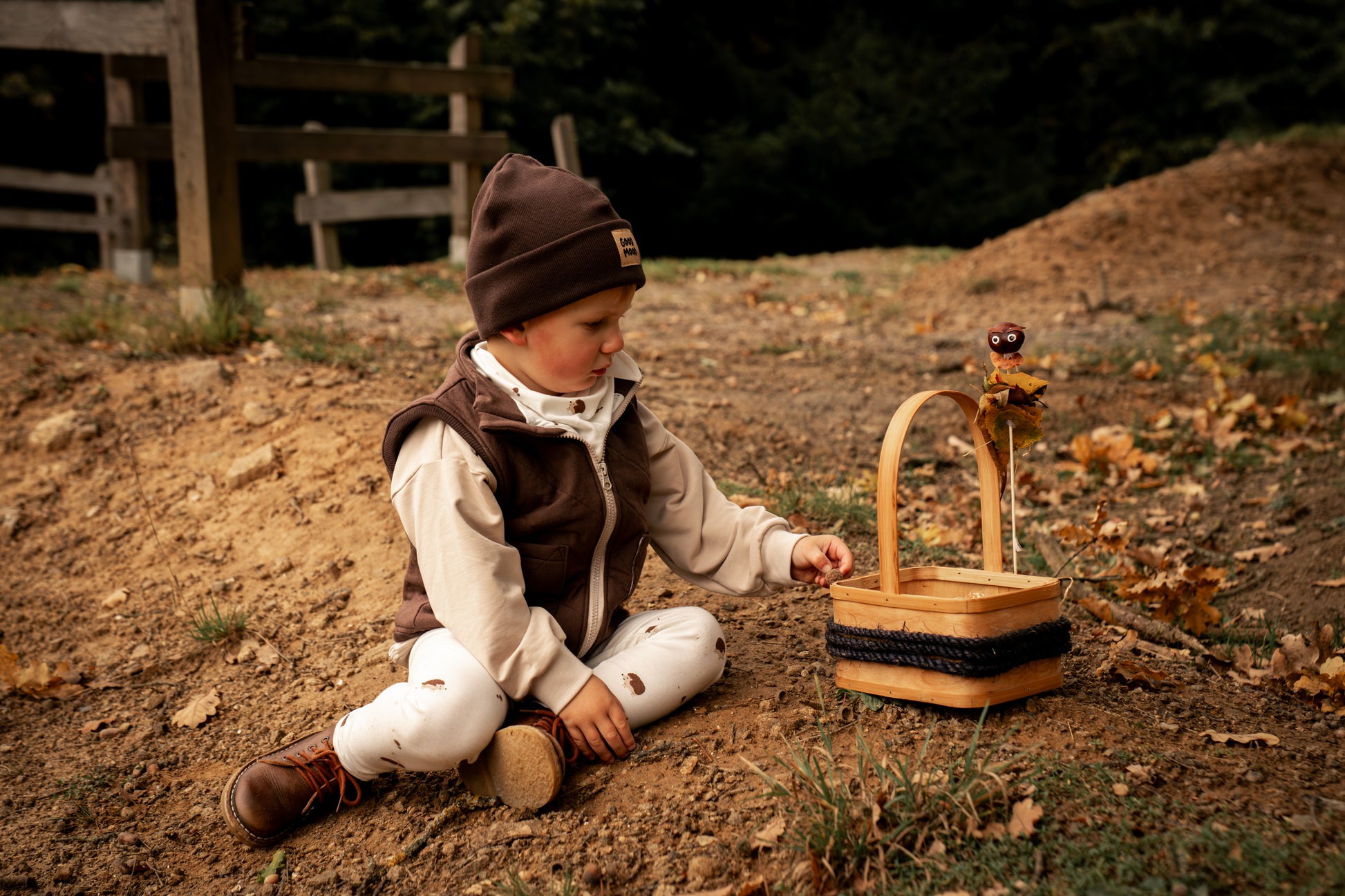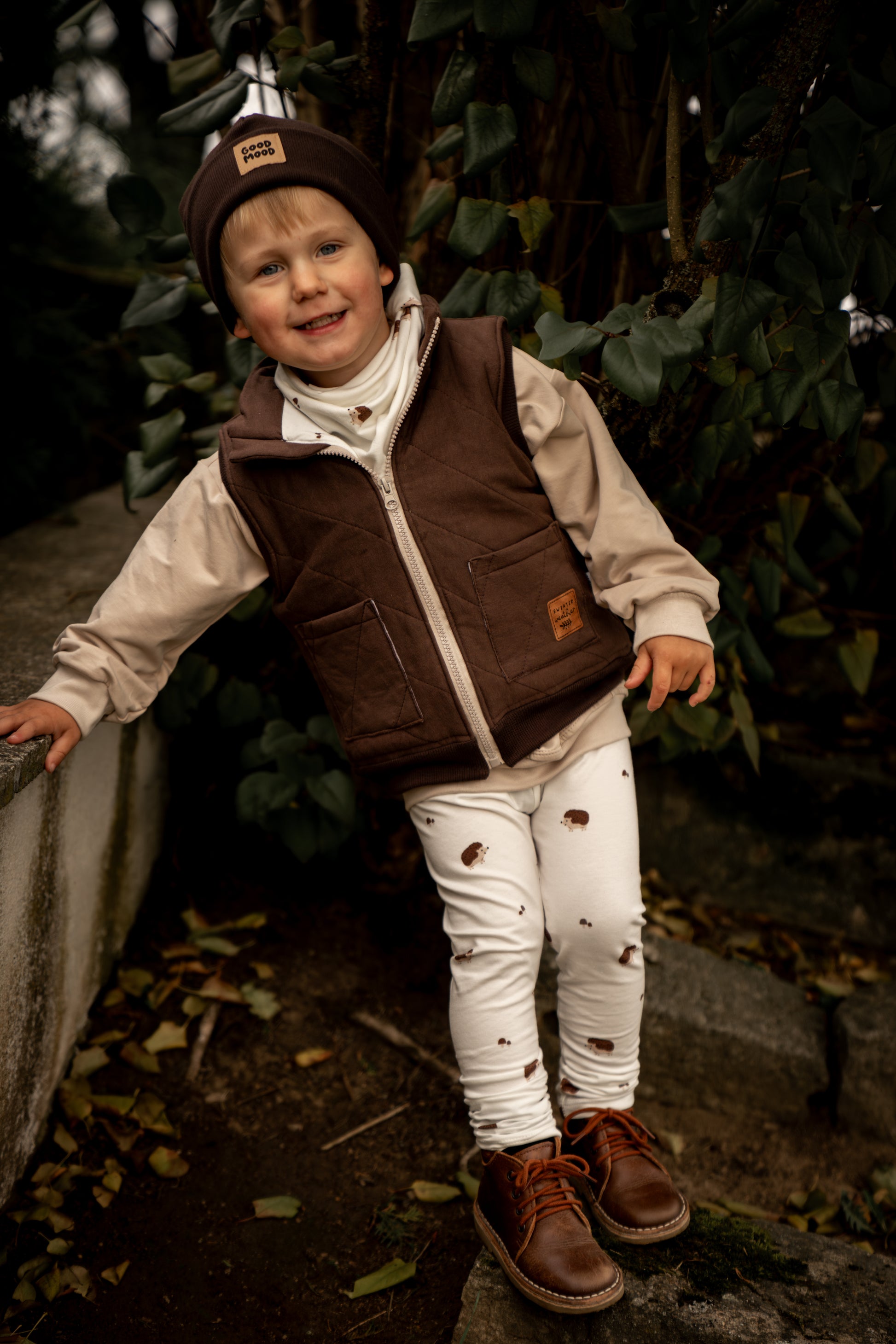 Vorne lässt sich die Weste mit einem praktischen Reißverschluss schließen – auf Wunsch auch mit einem magnetischen Reißverschluss, damit Kinder sie ganz einfach selbst öffnen und schließen können. Zwei aufgesetzte Taschen bieten Platz für kleine Schätze, und ein liebevolles Detail ist das Label „Sweater Weather“ auf einer der Taschen.