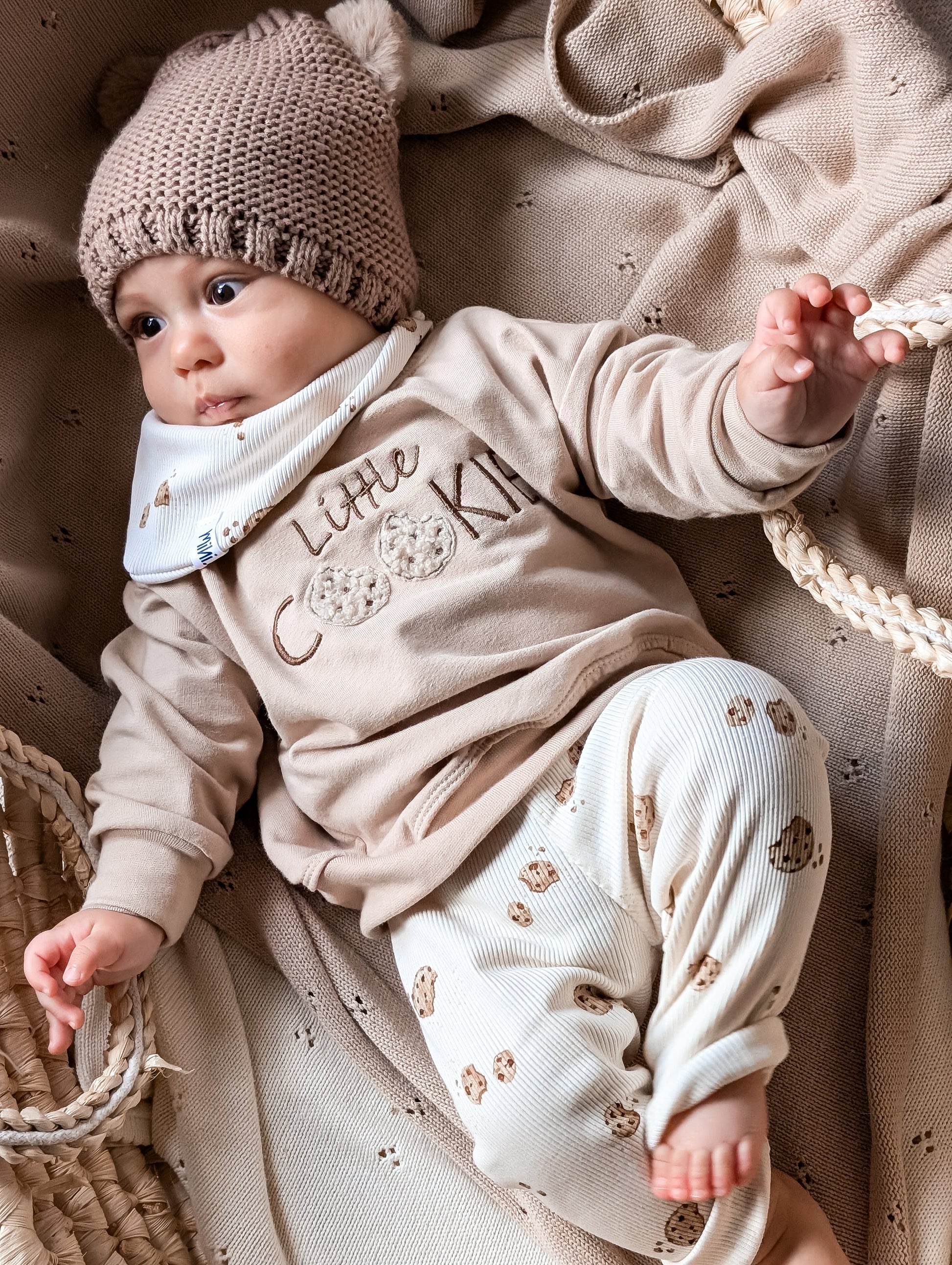 Der Oversized Sweater mit dem Stickbild "Little Cookie" ist ein oversized geschnittener Pullover aus beigen French Terry/Jersey, der bis zu zwei Größen mitwächst. Das passende Halstuch kann mir dazu gewählt werden.