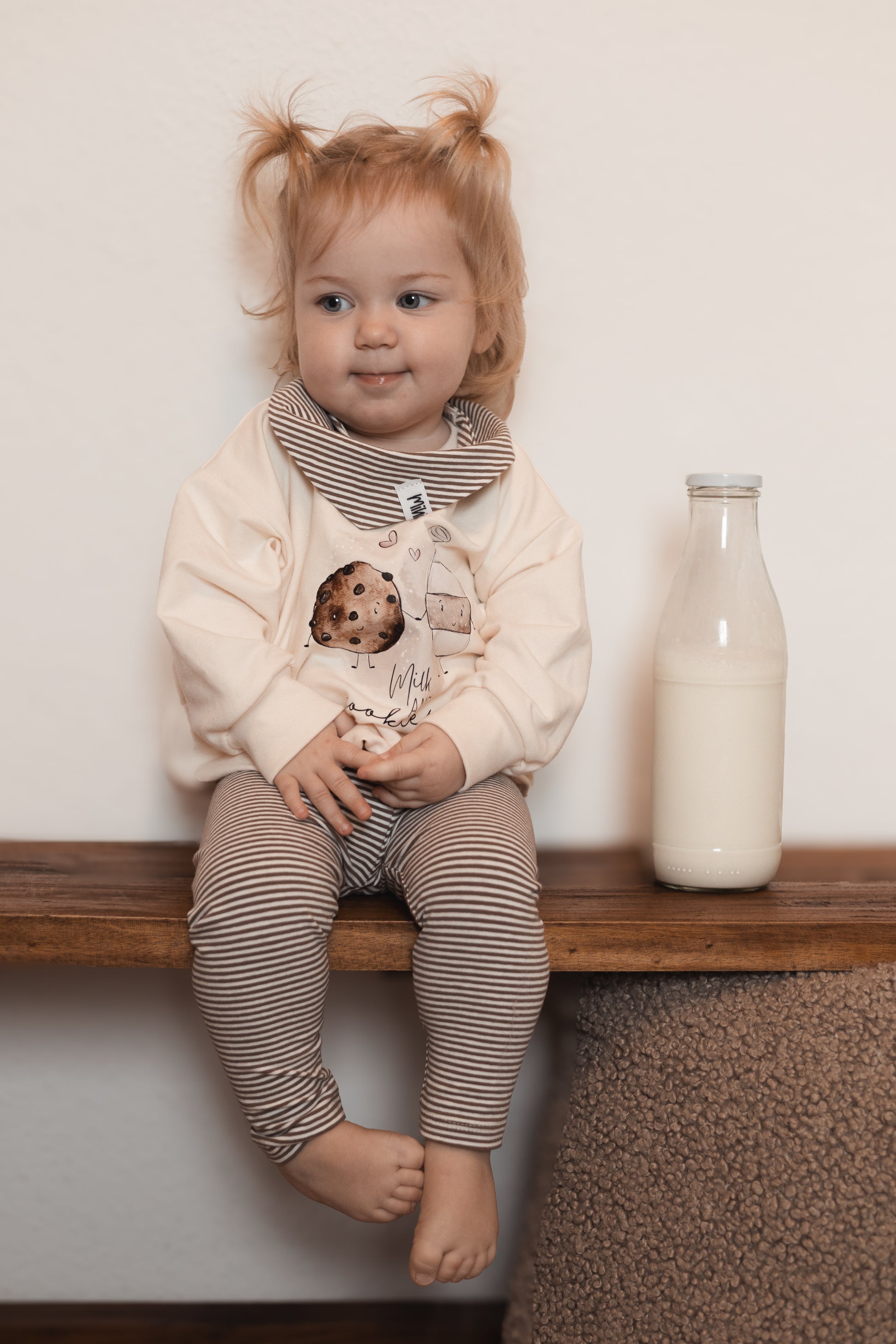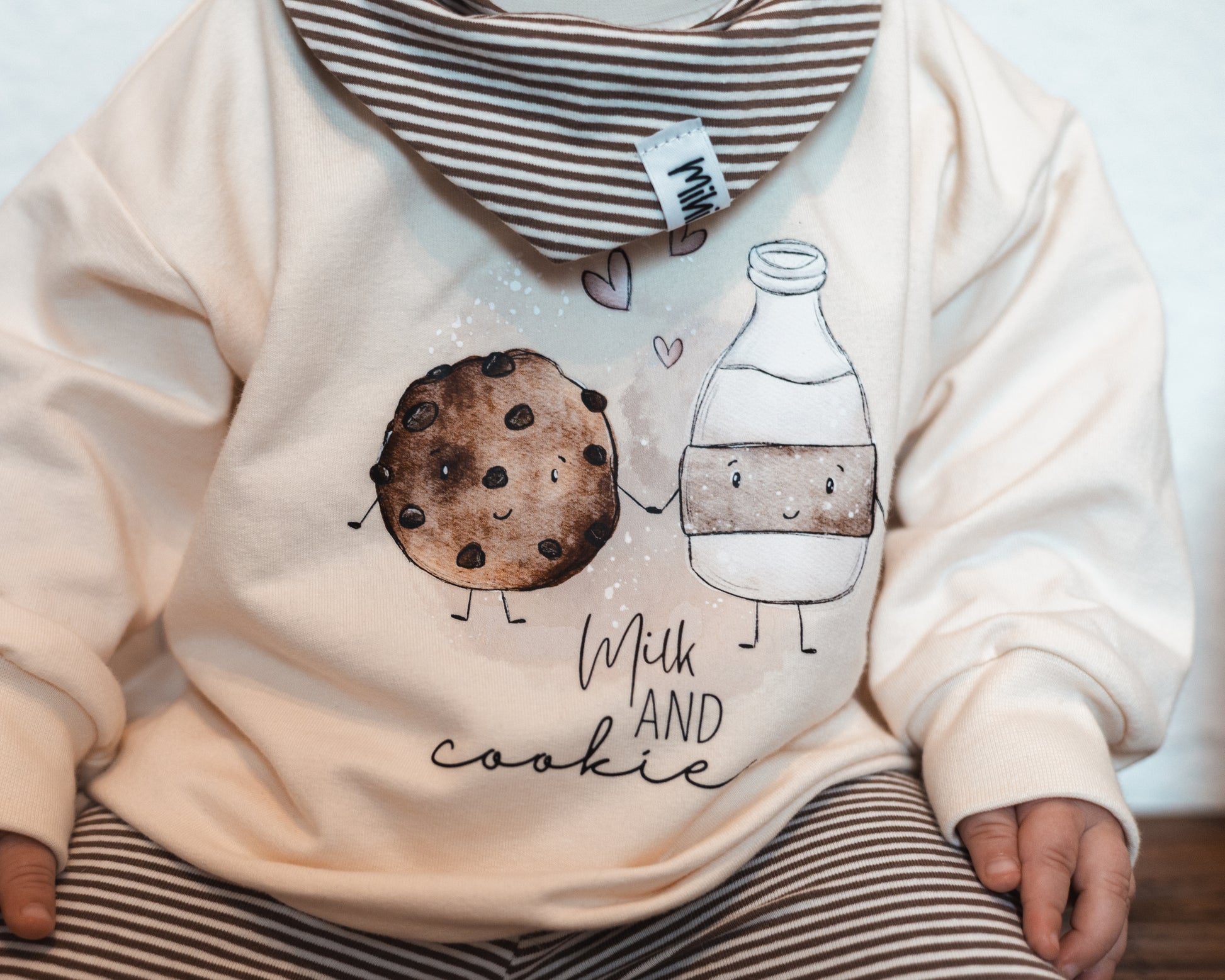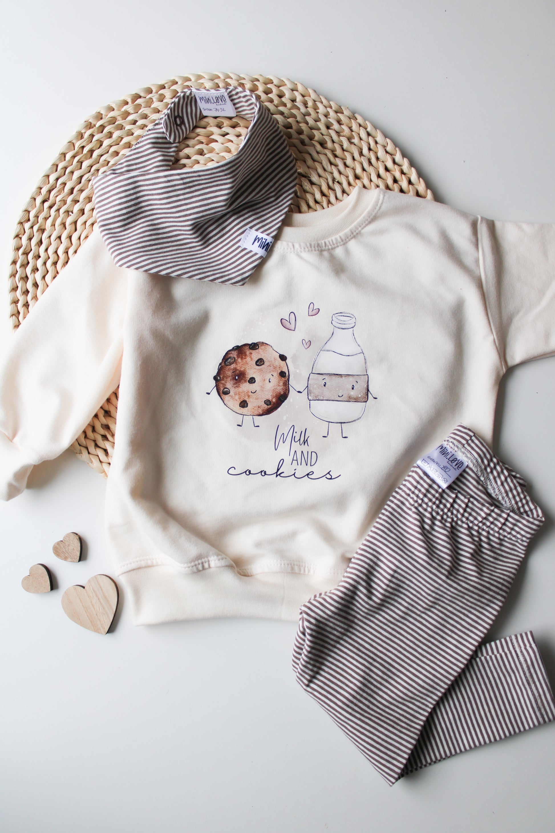 Das Set besteht aus einem cremefarbenen oversized Sweater mit dem Bügelbild "Milk and Cookies".