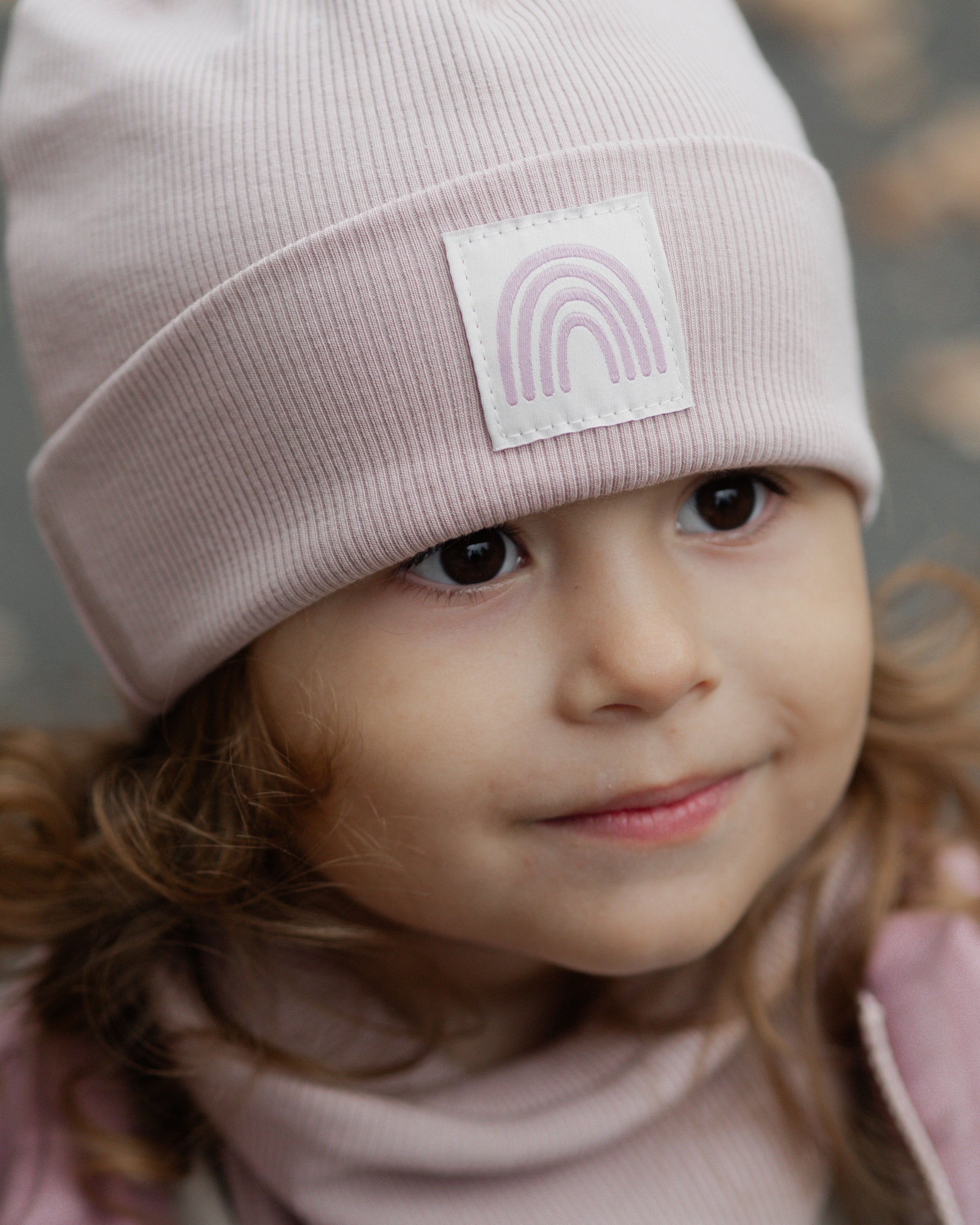 Die Beanie überzeugt mit ihrem modernen, lässigen Schnitt und einem liebevoll aufgenähten Label mit Regenbogenmotiv auf der Vorderseite. Der Loop ist doppellagig genäht und mit einem kleinen Label „cutest one“ verziert – ein süßes Detail, das das Outfit abrundet.
