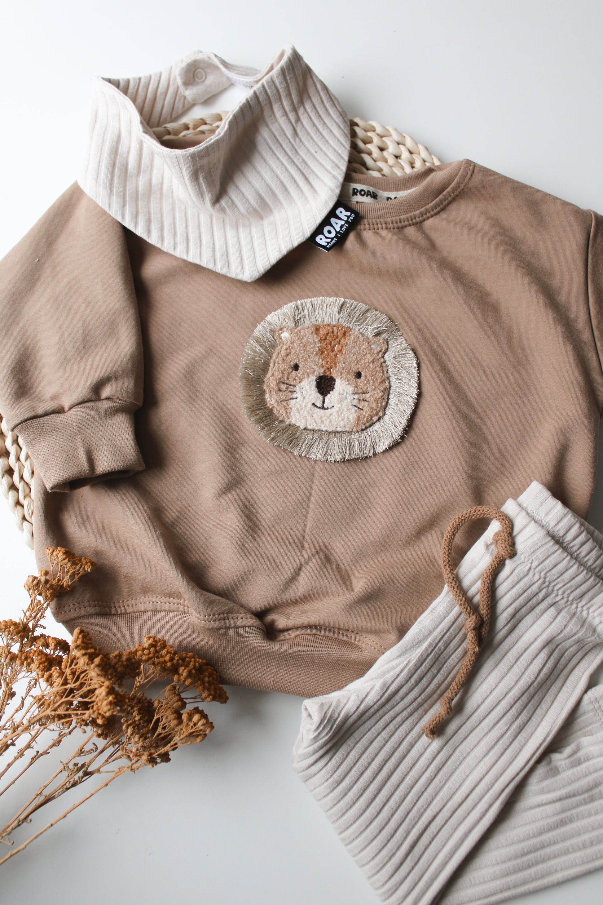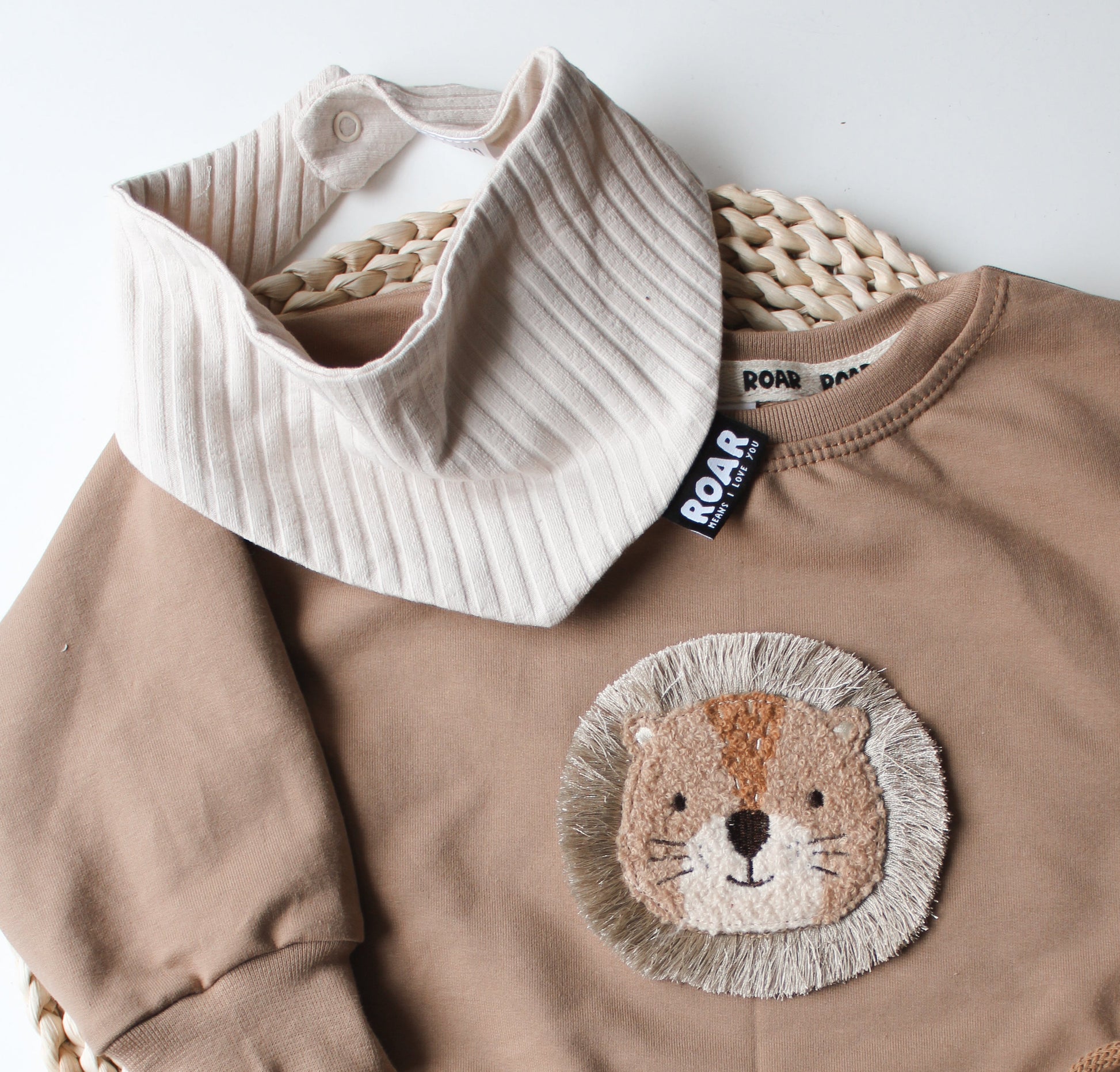 Das Tuch ist doppellagig genäht und mit einem praktischen Druckknopfverschluss ausgestattet, sodass es sich leicht an- und ausziehen lässt. Ein besonderes Detail ist das aufgenähte Label mit der Aufschrift „ROAR means I love you“, das dem Accessoire eine liebevolle, verspielte Note verleiht.