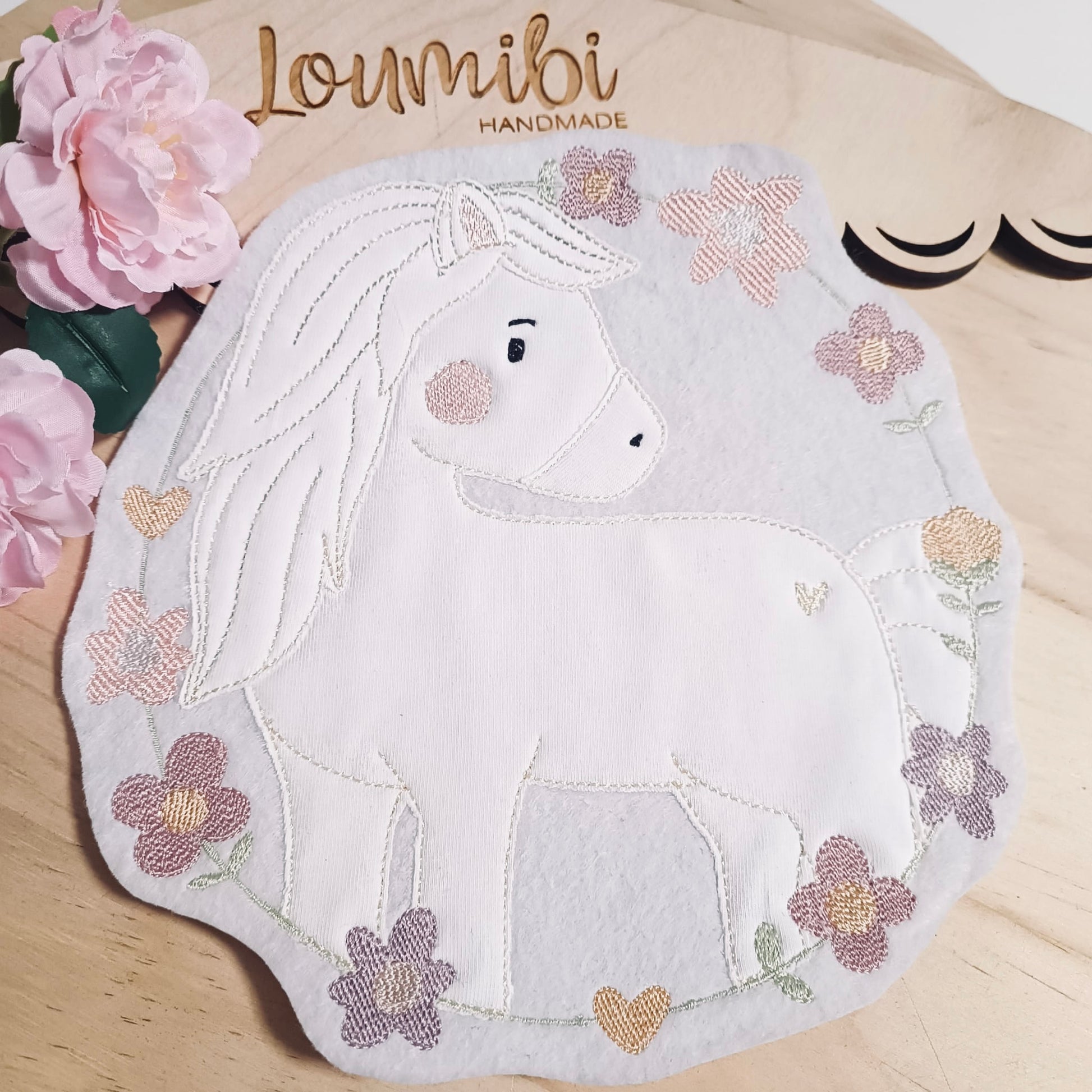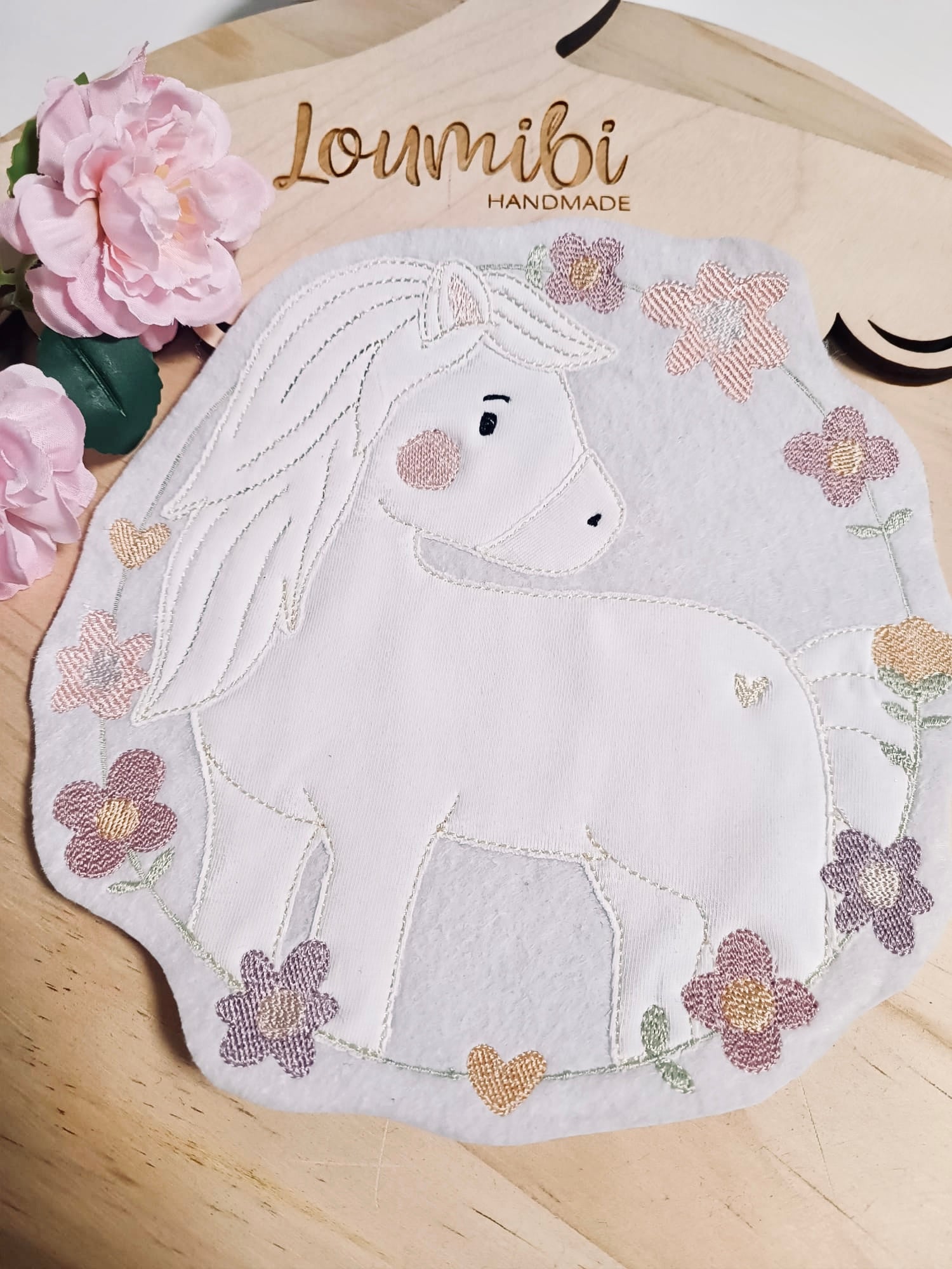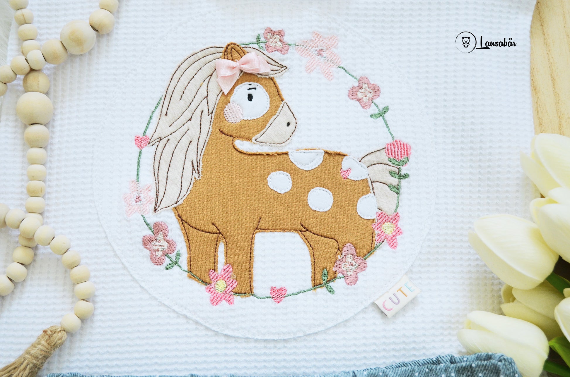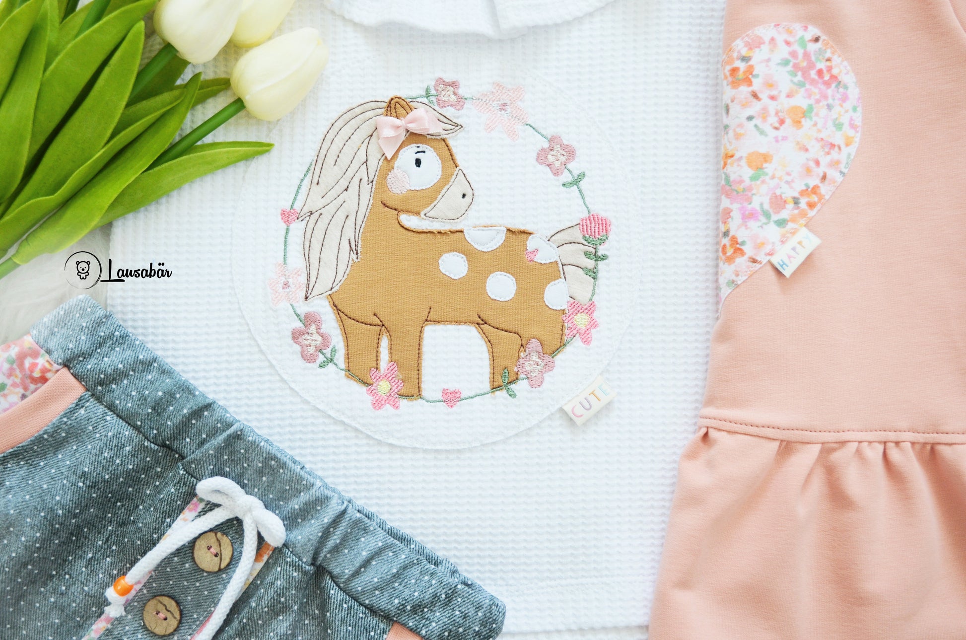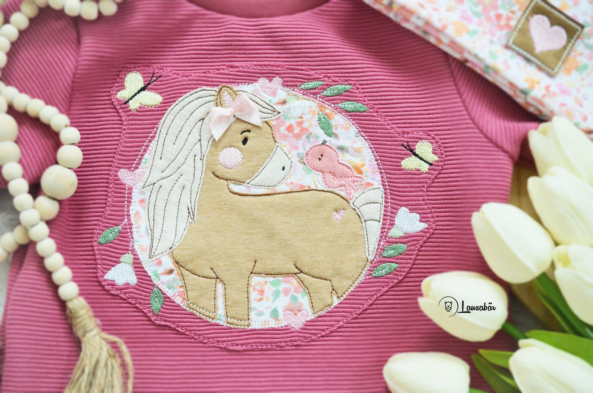 Mit dem Kauf dieser Dateien erhälst du zwei verschiedenen Varianten des Pony, einmal im Blumenkreis mit seinem kleinen Freund Piep und einmal mit Schmetterlingen.