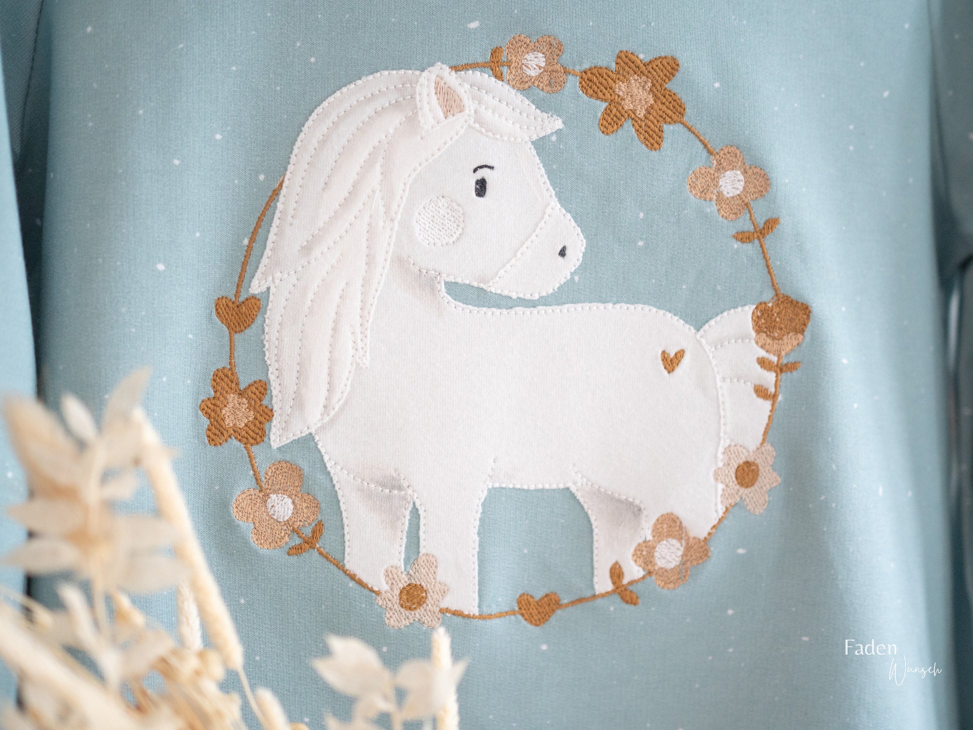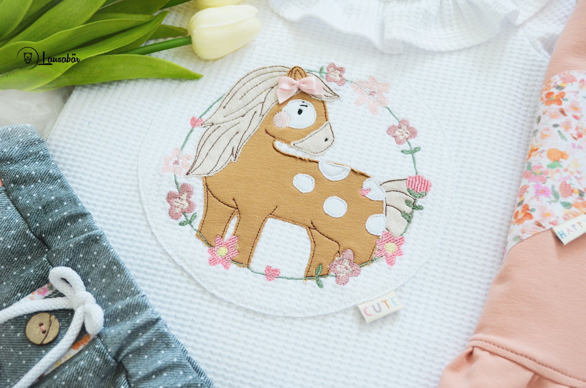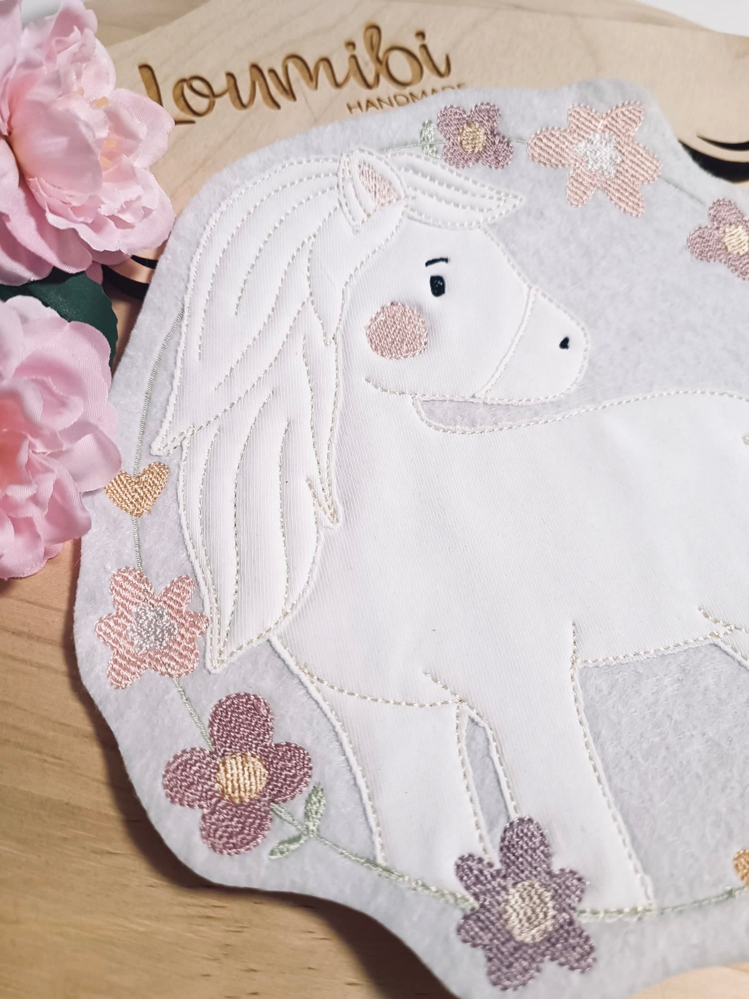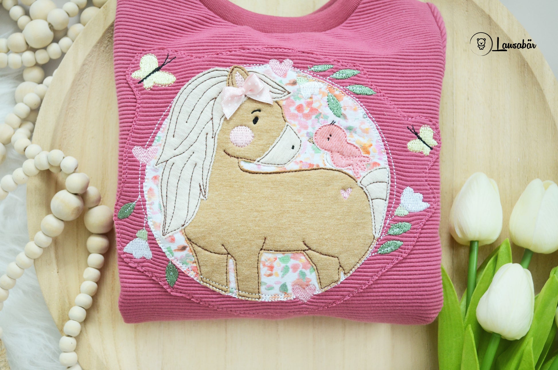Mit dem Kauf dieser Dateien erhälst du zwei verschiedenen Varianten des Pony, einmal im Blumenkreis mit seinem kleinen Freund Piep und einmal mit Schmetterlingen.